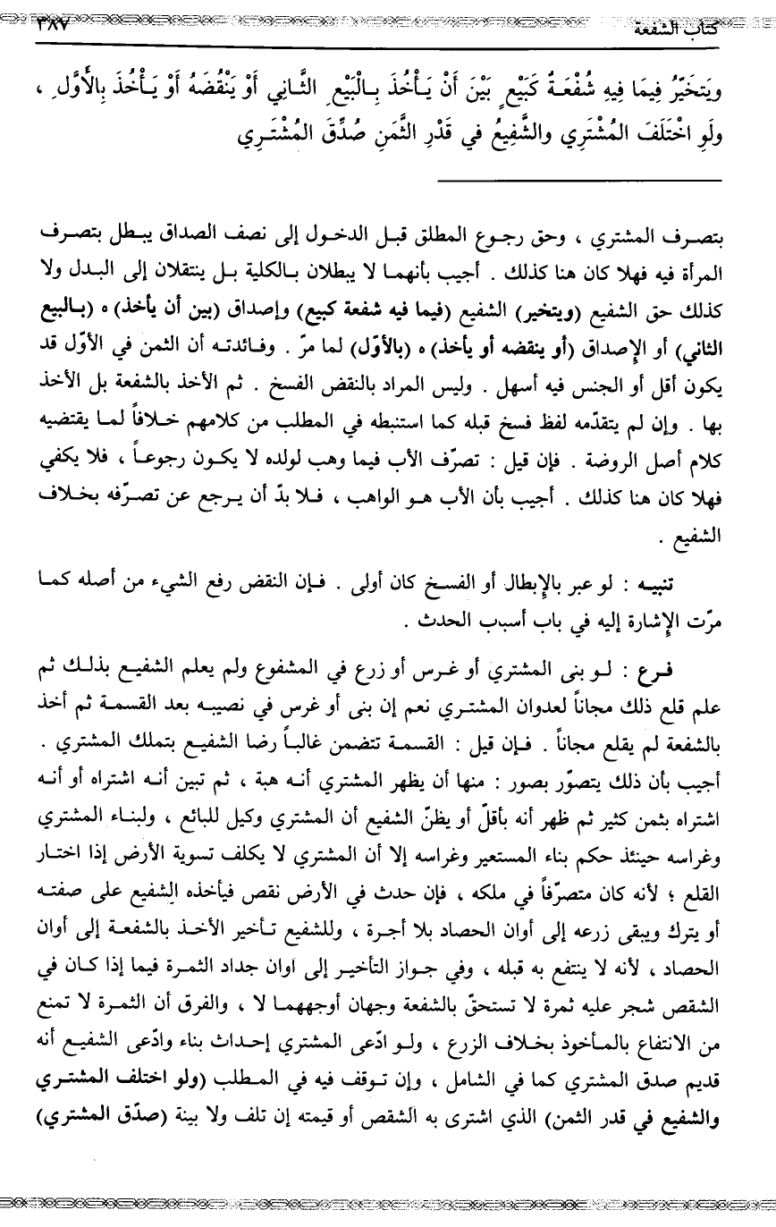 أُجِيبَ بِأَنَّهُمَا لَا يَبْطُلَانِ بِالْكُلِّيَّةِ بَلْ يَنْتَقِلَانِ إلَى الْبَدَلِ وَلَا كَذَلِكَ حَقُّ الشَّفِيعِ (وَيَتَخَيَّرُ) الشَّفِيعُ (فِيمَا فِيهِ شُفْعَةٌ كَبَيْعٍ) وَإِصْدَاقٍ (بَيْنَ أَنْ يَأْخُذَهُ) (بِالْبَيْعِ الثَّانِي) أَوْ الْإِصْدَاقِ (أَوْ يَنْقُضَهُ أَوْ يَأْخُذَ) هـ (بِالْأَوَّلِ) لِمَا مَرَّ. وَفَائِدَتُهُ أَنَّ الثَّمَنَ فِي الْأَوَّلِ قَدْ يَكُونُ أَقَلَّ أَوْ الْجِنْسَ فِيهِ أَسْهَلُ. وَلَيْسَ الْمُرَادُ بِالنَّقْضِ الْفَسْخُ. ثُمَّ الْأَخْذُ بِالشُّفْعَةِ بَلْ الْأَخْذُ بِهَا. وَإِنْ لَمْ يَتَقَدَّمْهُ لَفْظُ فَسْخٍ قَبْلَهُ كَمَا اسْتَنْبَطَهُ فِي الْمَطْلَبِ مِنْ كَلَامِهِمْ خِلَافًا لِمَا يَقْتَضِيهِ كَلَامُ أَصْلِ الرَّوْضَةِ. فَإِنْ قِيلَ: تَصَرُّفُ الْأَبِ فِيمَا وَهَبَ لِوَلَدِهِ لَا يَكُونُ رُجُوعًا، فَلَا يَكْفِي فَهَلَّا كَانَ هُنَا كَذَلِكَ.