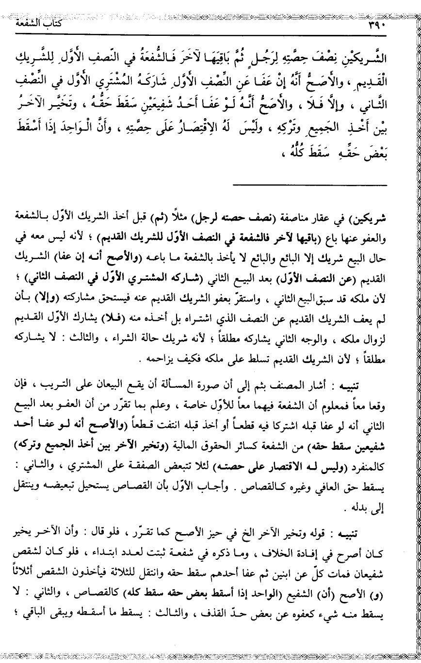الشَّرِيكَيْنِ نِصْفَ حِصَّتِهِ لِرَجُلٍ ثُمَّ بَاقِيَهَا لِآخَرَ فَالشُّفْعَةُ فِي النِّصْفِ الْأَوَّلِ لِلشَّرِيكِ الْقَدِيمِ، وَالْأَصَحُّ أَنَّهُ إنْ عَفَا عَنْ النِّصْفِ الْأَوَّلِ شَارَكَهُ الْمُشْتَرِي الْأَوَّلُ فِي النِّصْفِ الثَّانِي، وَإِلَّا فَلَا.