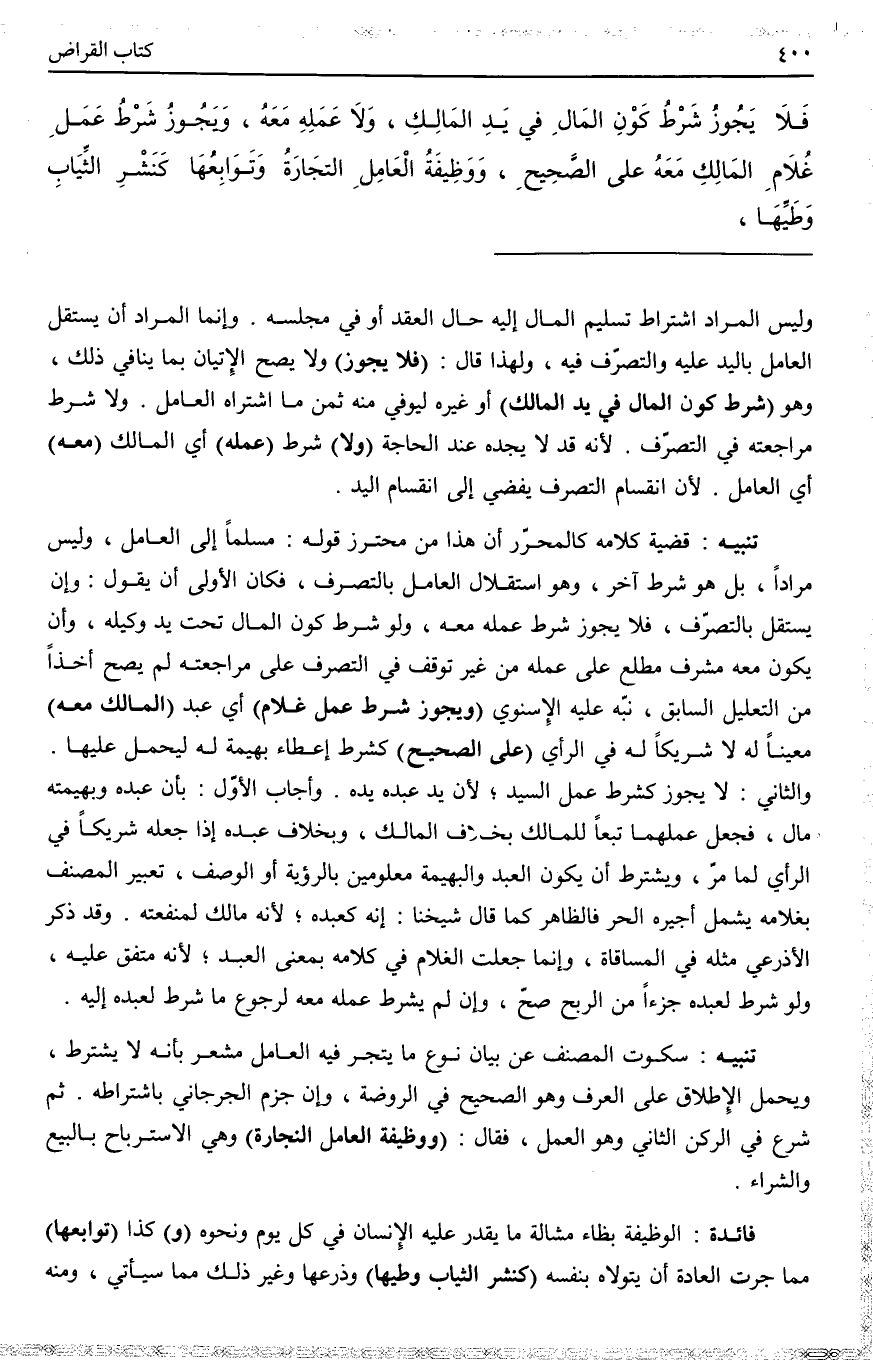 تَنْبِيهٌ قَضِيَّةُ كَلَامِهِ كَالْمُحَرَّرِ أَنَّ هَذَا مِنْ مُحْتَرَزِ قَوْلِهِ: مُسَلَّمًا إلَى الْعَامِلِ، وَلَيْسَ مُرَادًا، بَلْ هُوَ شَرْطٌ آخَرُ، وَهُوَ اسْتِقْلَالُ الْعَامِلِ بِالتَّصَرُّفِ، فَكَانَ الْأَوْلَى أَنْ يَقُولَ: وَأَنْ يَسْتَقِلَّ بِالتَّصَرُّفِ، فَلَا يَجُوزُ شَرْطُ عَمَلِهِ مَعَهُ، وَلَوْ شَرَطَ كَوْنَ الْمَالِ تَحْتَ يَدِ وَكِيلِهِ، وَأَنْ يَكُونَ مَعَهُ مُشْرِفٌ مُطَّلِعٌ عَلَى عَمَلِهِ مِنْ غَيْرٍ تَوَقُّفٍ فِي التَّصَرُّفِ عَلَى مُرَاجَعَتِهِ لَمْ يَصِحَّ أَخْذًا مِنْ التَّعْدِيلِ السَّابِقِ، نَبَّهَ عَلَيْهِ الْإِسْنَوِيُّ. (وَيَجُوزُ شَرْطُ عَمَلِ غُلَامِ) أَيْ عَبْدِ (الْمَالِكِ مَعَهُ) مُعِينًا لَهُ لَا شَرِيكًا لَهُ فِي الرَّأْيِ (عَلَى الصَّحِيحِ) كَشَرْطِ إعْطَاءِ بَهِيمَةٍ لَهُ لِيَحْمِلَ عَلَيْهَا. وَالثَّانِي: لَا يَجُوزُ كَشَرْطِ عَمَلِ السَّيِّدِ؛ لِأَنَّ يَدَ عَبْدِهِ يَدُهُ.