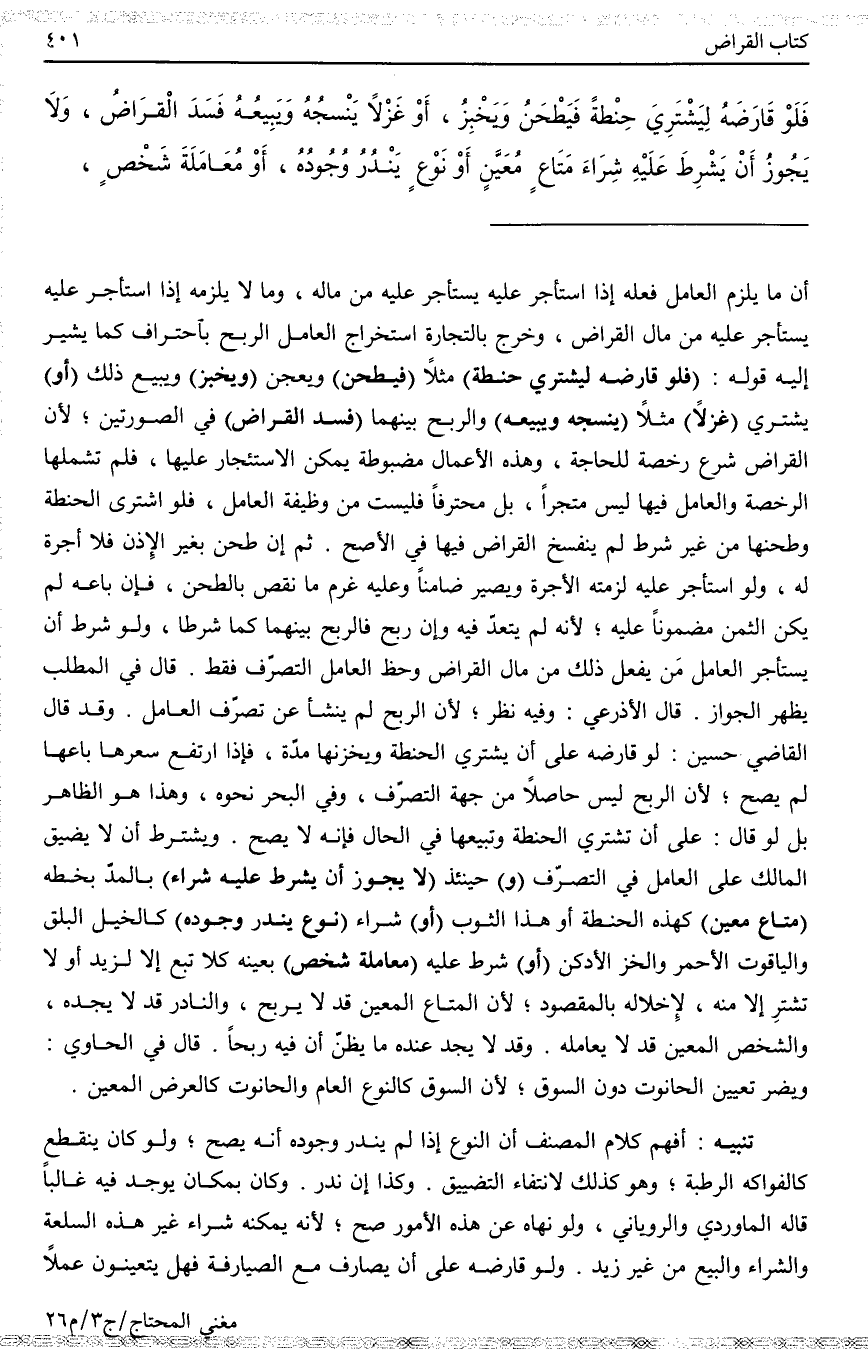 ـــــــــــــــــــــــــــــQأَنَّ مَا يَلْزَمُ الْعَامِلَ فِعْلُهُ - إذَا اسْتَأْجَرَ عَلَيْهِ يَسْتَأْجِرُ عَلَيْهِ مِنْ مَالِهِ، وَمَا لَا يَلْزَمُهُ إذَا اسْتَأْجَرَ عَلَيْهِ يَسْتَأْجِرُ عَلَيْهِ مِنْ مَالِ الْقِرَاضِ، وَخَرَجَ بِالتِّجَارَةِ اسْتِخْرَاجُ الْعَامِلِ الرِّبْحَ بِاحْتِرَافٍ، كَمَا يُشِيرُ إلَيْهِ قَوْلُهُ: (فَلَوْ قَارَضَهُ لِيَشْتَرِيَ حِنْطَةً) مَثَلًا (فَيَطْحَنَ) وَيَعْجِنَ (وَيَخْبِزَ) وَيَبِيعَ ذَلِكَ، (أَوْ) يَشْتَرِيَ (غَزْلًا) مَثَلًا (يَنْسِجُهُ وَيَبِيعُهُ) وَالرِّبْحُ بَيْنَهُمَا - (فَسَدَ الْقِرَاضُ) فِي الصُّورَتَيْنِ؛ لِأَنَّ الْقِرَاضَ شُرِعَ رُخْصَةً لِلْحَاجَةِ، وَهَذِهِ الْأَعْمَالُ مَضْبُوطَةٌ يُمْكِنُ الِاسْتِئْجَارُ عَلَيْهَا، فَلَمْ تَشْمَلْهَا الرُّخْصَةُ، وَالْعَامِلُ فِيهَا لَيْسَ مُتَّجِرًا، بَلْ مُحْتَرِفًا فَلَيْسَتْ مِنْ وَظِيفَةِ الْعَامِلِ، فَلَوْ اشْتَرَى الْحِنْطَةَ وَطَحَنَهَا مِنْ غَيْرِ شَرْطٍ لَمْ يَنْفَسِخْ الْقِرَاضُ فِيهَا فِي الْأَصَحِّ. ثُمَّ إنْ طَحَنَ بِغَيْرِ الْإِذْنِ فَلَا أُجْرَةَ لَهُ، وَلَوْ اسْتَأْجَرَ عَلَيْهِ لَزِمَتْهُ الْأُجْرَةُ، وَيَصِيرُ ضَامِنًا، وَعَلَيْهِ غُرْمُ مَا نَقَصَ بِالطَّحْنِ، فَإِنْ بَاعَهُ لَمْ يَكُنْ الثَّمَنُ مَضْمُونًا عَلَيْهِ؛ لِأَنَّهُ لَمْ يُعْتَدَّ فِيهِ، وَإِنْ رَبِحَ فَالرِّبْحُ بَيْنَهُمَا كَمَا شَرَطَا، وَلَوْ شَرَطَ أَنْ يَسْتَأْجِرَ الْعَامِلُ مَنْ يَفْعَلُ ذَلِكَ مِنْ مَالِ الْقِرَاضِ، وَحَظُّ الْعَامِلِ التَّصَرُّفُ فَقَطْ. قَالَ فِي الْمَطْلَبِ: يَظْهَرُ الْجَوَازُ. قَالَ الْأَذْرَعِيُّ: وَفِيهِ نَظَرٌ؛ لِأَنَّ الرِّبْحَ لَمْ يَنْشَأْ عَنْ تَصَرُّفِ الْعَامِلِ. وَقَدْ قَالَ الْقَاضِي حُسَيْنٌ: لَوْ قَارَضَهُ عَلَى أَنْ يَشْتَرِيَ الْحِنْطَةَ وَيُخَزِّنَهَا مُدَّةً، فَإِذَا ارْتَفَعَ سِعْرُهَا بَاعَهَا - لَمْ يَصِحَّ؛ لِأَنَّ الرِّبْحَ لَيْسَ حَاصِلًا مِنْ جِهَةِ التَّصَرُّفِ. وَفِي الْبَحْرِ نَحْوُهُ، وَهَذَا هُوَ الظَّاهِرُ. بَلْ لَوْ قَالَ: عَلَى أَنْ تَشْتَرِيَ الْحِنْطَةَ وَتَبِيعَهَا فِي الْحَالِ فَإِنَّهُ لَا يَصِحُّ.
