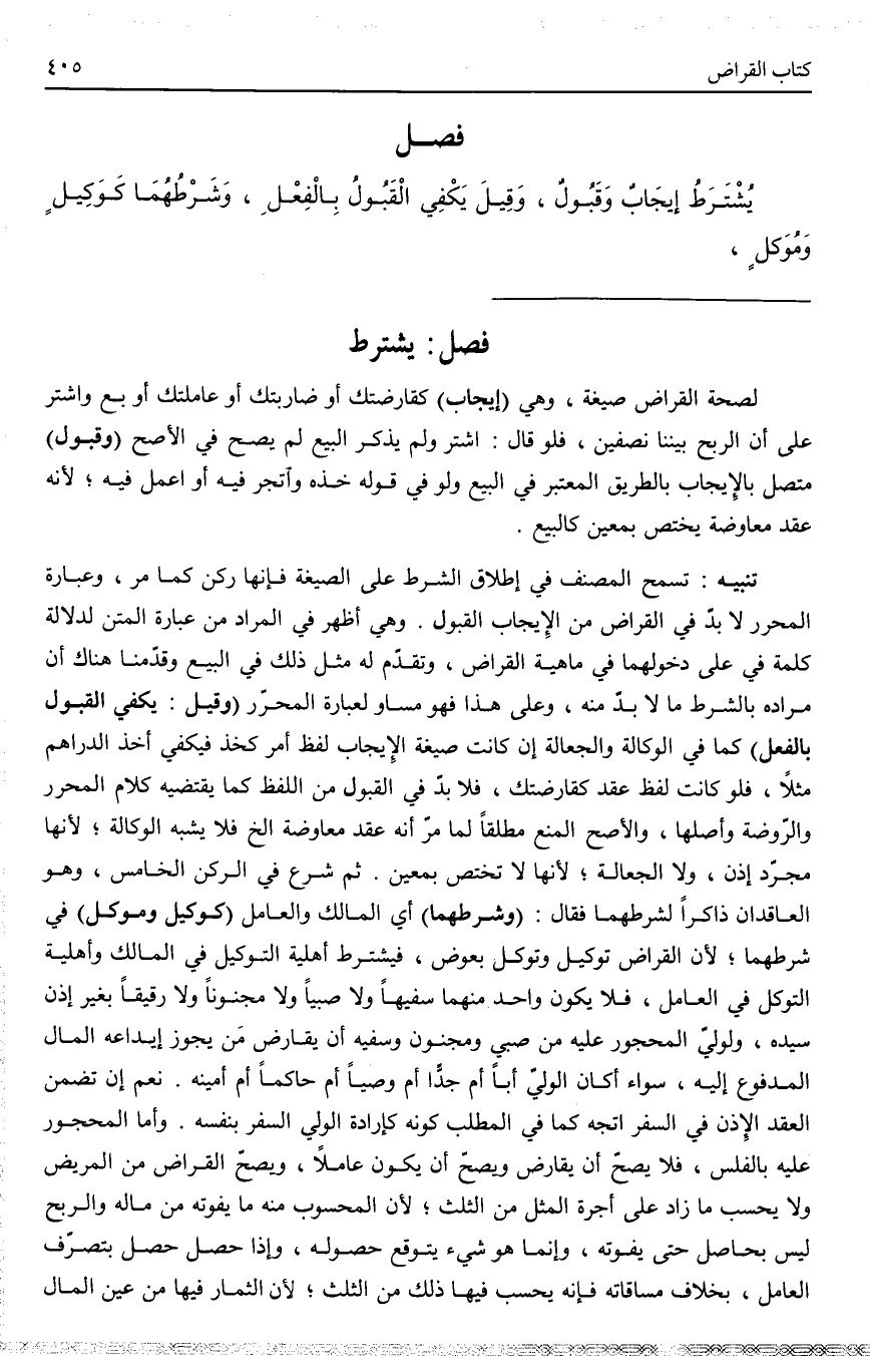 تَنْبِيهٌ تَسَمَّحَ الْمُصَنِّفُ فِي إطْلَاقِ الشَّرْطِ عَلَى الصِّيغَةِ، فَإِنَّهَا رُكْنٌ كَمَا مَرَّ، وَعِبَارَةُ الْمُحَرَّرِ لَا بُدَّ فِي الْقِرَاضِ مِنْ الْإِيجَابِ وَالْقَبُولِ وَهِيَ أَظْهَرُ فِي الْمُرَادِ مِنْ عِبَارَةِ الْمَتْنِ؛ لِدَلَالَةِ كَلِمَةِ فِي عَلَى دُخُولِهِمَا فِي مَاهِيَّةِ الْقِرَاضِ، وَتَقَدَّمَ لَهُ مِثْلُ ذَلِكَ فِي الْبَيْعِ، وَقَدَّمْنَا هُنَاكَ أَنَّ مُرَادَهُ بِالشَّرْطِ مَا لَا بُدَّ مِنْهُ، وَعَلَى هَذَا فَهُوَ مُسَاوٍ لِعِبَارَةِ الْمُحَرَّرِ، (وَقِيلَ: يَكْفِي الْقَبُولُ بِالْفِعْلِ) كَمَا فِي الْوَكَالَةِ وَالْجَعَالَةِ إنْ كَانَتْ صِيغَةُ الْإِيجَابِ لَفْظَ أَمْرٍ كَخُذْ، فَيَكْفِي أَخْذُ الدَّرَاهِمِ مَثَلًا، فَلَوْ كَانَتْ لَفْظَ عَقْدٍ كَقَارَضْتُكَ فَلَا بُدَّ فِي الْقَبُولِ مِنْ اللَّفْظِ كَمَا يَقْتَضِيهِ كَلَامُ الْمُحَرَّرِ وَالرَّوْضَةِ وَأَصْلِهَا، وَالْأَصَحُّ الْمَنْعُ مُطْلَقًا لِمَا مَرَّ أَنَّهُ عَقْدُ مُعَاوَضَةٍ إلَخْ، فَلَا يُشْبِهُ الْوَكَالَةَ؛ لِأَنَّهَا مُجَرَّدُ إذْنٍ، وَلَا الْجَعَالَةَ؛ لِأَنَّهَا لَا تَخْتَصُّ بِمُعَيَّنٍ.