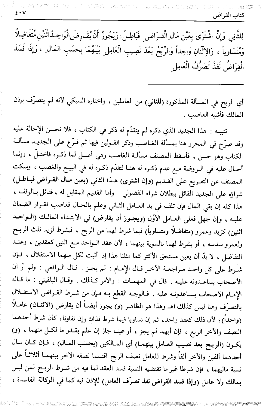 تَنْبِيهٌ هَذَا الْجَدِيدُ الَّذِي ذَكَرَهُ لَمْ يَتَقَدَّمْ لَهُ ذِكْرٌ فِي الْكِتَابِ، فَلَا تَحْسُنُ الْإِحَالَةُ عَلَيْهِ، وَقَدْ صَرَّحَ فِي الْمُحَرَّرِ هُنَا بِمَسْأَلَةِ الْغَاصِبِ وَذَكَرَ الْقَوْلَيْنِ فِيهَا، ثُمَّ فَرَّعَ عَلَى الْجَدِيدِ مَسْأَلَةَ الْكِتَابِ وَهُوَ حَسَنٌ، فَأَسْقَطَ الْمُصَنِّفُ مَسْأَلَةَ الْغَاصِبِ وَهِيَ أَصْلٌ لِمَا ذَكَرَهُ فَاخْتَلَّ، وَإِنَّمَا أَحَالَ عَلَيْهِ فِي الرَّوْضَةِ مَعَ عَدَمِ ذِكْرِهِ لَهُ هُنَا لِتَقَدُّمِ ذِكْرِهِ لَهُ فِي الْبَيْعِ وَالْغَصْبِ، وَسَكَتَ الْمُصَنِّفُ عَنْ التَّفْرِيعِ عَلَى الْقَدِيمِ. (وَإِنْ اشْتَرَى) هَذَا الثَّانِي (بِعَيْنِ مَالِ الْقِرَاضِ فَبَاطِلٌ) شِرَاؤُهُ عَلَى الْجَدِيدِ الْقَائِلِ بِبُطْلَانِ شِرَاءِ الْفُضُولِيِّ. وَأَمَّا الْقَدِيمُ الْمُقَابِلُ لَهُ، فَقَائِلٌ بِالْوَقْفِ، هَذَا كُلُّهُ إنْ بَقِيَ الْمَالُ، فَإِنْ تَلَفَ فِي يَدِ الْعَامِلِ الثَّانِي وَعَلِمَ بِالْحَالِ فَغَاصِبٌ، فَقَرَارُ الضَّمَانِ عَلَيْهِ، وَإِنْ جَهِلَ فَعَلَى الْعَامِلِ الْأَوَّلِ.