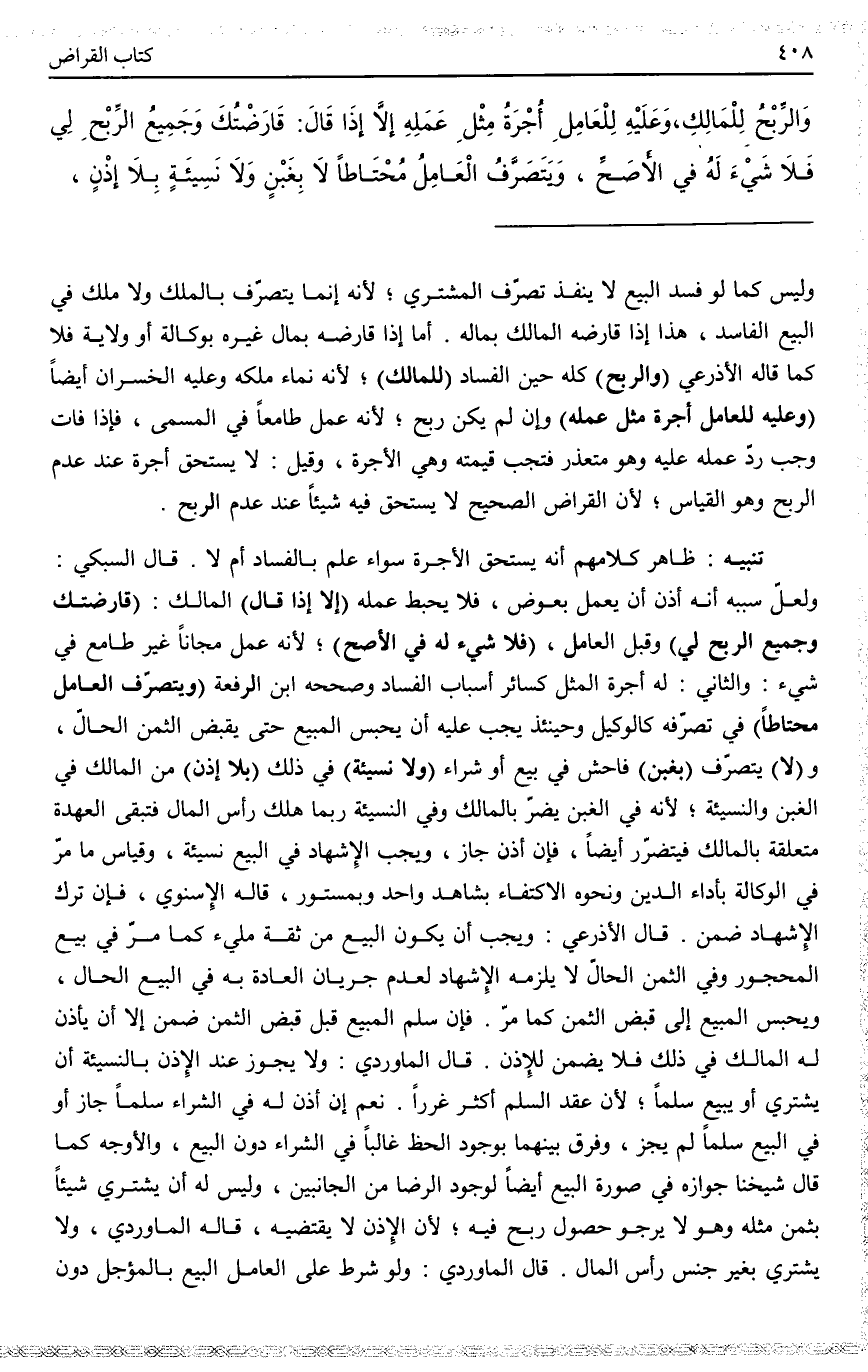 تَنْبِيهٌ ظَاهِرُ كَلَامِهِمْ أَنَّهُ يَسْتَحِقُّ الْأُجْرَةَ سَوَاءٌ أَعَلِمَ بِالْفَسَادِ أَمْ لَا. قَالَ السُّبْكِيُّ: وَلَعَلَّ سَبَبَهُ أَنَّهُ أُذِنَ أَنْ يَعْمَلَ بِعِوَضٍ، فَلَا يُحْبَطُ عَمَلُهُ (إلَّا إذَا قَالَ) الْمَالِكُ: (قَارَضْتُك وَجَمِيعُ الرِّبْحِ لِي) وَقَبِلَ الْعَامِلُ، (فَلَا شَيْءَ لَهُ فِي الْأَصَحِّ) ؛ لِأَنَّهُ عَمِلَ مَجَّانًا غَيْرَ طَامِعٍ فِي شَيْءٍ. وَالثَّانِي: لَهُ أُجْرَةُ الْمِثْلِ كَسَائِرِ أَسْبَابِ الْفَسَادِ، وَصَحَّحَهُ ابْنُ الرِّفْعَةِ. (وَيَتَصَرَّفُ الْعَامِلُ مُحْتَاطًا) فِي تَصَرُّفِهِ كَالْوَكِيلِ، وَحِينَئِذٍ يَجِبُ عَلَيْهِ أَنْ يَحْبِسَ الْمَبِيعَ حَتَّى يَقْبِضَ الثَّمَنَ الْحَالَّ، وَ (لَا) يَتَصَرَّفُ (بِغَبْنٍ) فَاحِشٍ فِي بَيْعٍ أَوْ شِرَاءٍ، (وَلَا نَسِيئَةٍ) فِي ذَلِكَ (بِلَا إذْنٍ) مِنْ الْمَالِكِ فِي الْغَبْنِ وَالنَّسِيئَةِ؛ لِأَنَّهُ فِي الْغَبْنِ يَضُرُّ بِالْمَالِكِ، وَفِي النَّسِيئَةِ رُبَّمَا هَلَكَ رَأْسُ الْمَالِ فَتَبْقَى الْعُهْدَةُ مُتَعَلِّقَةً بِالْمَالِكِ فَيَتَضَرَّرُ أَيْضًا، فَإِنْ أَذِنَ جَازَ، وَيَجِبُ الْإِشْهَادُ فِي الْبَيْعِ نَسِيئَةً، وَقِيَاسُ مَا مَرَّ فِي الْوَكَالَةِ بِأَدَاءِ الدَّيْنِ وَنَحْوِهِ الِاكْتِفَاءُ بِشَاهِدٍ وَاحِدٍ وَبِمَسْتُورٍ، قَالَهُ الْإِسْنَوِيُّ، فَإِنْ تَرَكَ الْإِشْهَادَ ضَمِنَ. قَالَ الْأَذْرَعِيُّ وَيَجِبُ أَنْ يَكُونَ الْبَيْعُ مِنْ ثِقَةٍ مَلِيءٍ كَمَا مَرَّ فِي بَيْعِ الْمَحْجُورِ، وَفِي الثَّمَنِ الْحَالِّ لَا يَلْزَمُهُ الْإِشْهَادُ لِعَدَمِ جَرَيَانِ الْعَادَةِ بِهِ فِي الْبَيْعِ الْحَالِّ، وَيُحْبَسُ الْمَبِيعُ إلَى قَبْضِ الثَّمَنِ كَمَا مَرَّ. فَإِنْ سَلَّمَ الْمَبِيعَ قَبْلَ قَبْضِ الثَّمَنِ ضَمِنَ إلَّا أَنْ يَأْذَنَ لَهُ الْمَالِكُ فِي ذَلِكَ فَلَا يَضْمَنُ لِلْإِذْنِ. قَالَ الْمَاوَرْدِيُّ: وَلَا يَجُوزُ عِنْدَ الْإِذْنِ بِالنَّسِيئَةِ أَنْ يَشْتَرِيَ أَوْ يَبِيعَ سَلَمًا؛ لِأَنَّ عَقْدَ السَّلَمِ أَكْثَرُ غَرَرًا. نَعَمْ، إنْ أَذِنَ لَهُ فِي الشِّرَاءِ سَلَمًا جَازَ، أَوْ فِي الْبَيْعِ سَلَمًا لَمْ يَجُزْ، وَفَرَّقَ بَيْنَهُمَا بِوُجُودِ الْحَظِّ غَالِبًا فِي الشِّرَاءِ دُونَ الْبَيْعِ،.