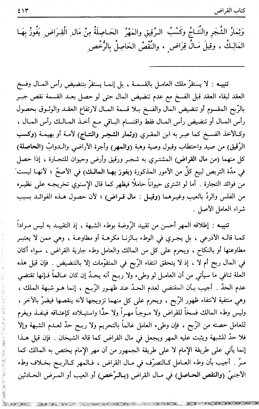 ـــــــــــــــــــــــــــــQتَنْبِيهٌ لَا يَسْتَقِرُّ مِلْكُ الْعَامِلِ بِالْقِسْمَةِ، بَلْ إنَّمَا يَسْتَقِرُّ بِتَنْضِيضِ رَأْسِ الْمَالِ وَفَسْخِ الْعَقْدِ لِبَقَاءِ الْعَقْدِ قَبْلَ الْفَسْخِ مَعَ عَدَمِ تَنْضِيضِ الْمَالِ، حَتَّى لَوْ حَصَلَ بَعْدَ الْقِسْمَةِ نَقْصٌ جُبِرَ بِالرِّبْحِ الْمَقْسُومِ، أَوْ تَنْضِيضِ الْمَالِ وَالْفَسْخِ بِلَا قِسْمَةِ الْمَالِ لِارْتِفَاعِ الْعَقْدِ وَالْوُثُوقِ بِحُصُولِ رَأْسِ الْمَالِ، أَوْ تَنْضِيضِ رَأْسِ الْمَالِ فَقَطْ وَاقْتِسَامِ الْبَاقِي مَعَ أَخْذِ الْمَالِكِ رَأْسَ الْمَالِ، وَكَالْأَخَذِ الْفَسْخُ كَمَا عَبَّرَ بِهِ ابْنُ الْمُقْرِي.