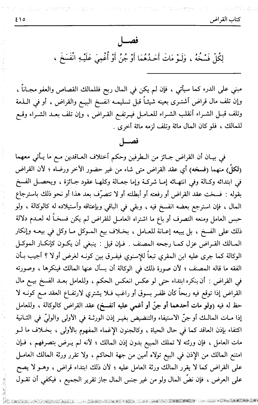 ِ، وَحُكْمُ اخْتِلَافِ الْعَاقِدَيْنِ مَعَ مَا يَأْتِي مَعَهُمَا. (لِكُلٍّ) مِنْهُمَا (فَسْخُهُ) أَيْ عَقْدِ الْقِرَاضِ مَتَى شَاءَ مِنْ غَيْرِ حُضُورِ الْآخَرِ وَرِضَاهُ؛ لِأَنَّ الْقِرَاضَ فِي ابْتِدَائِهِ وَكَالَةٌ، وَفِي انْتِهَائِهِ إمَّا شَرِكَةٌ وَإِمَّا جَعَالَةٌ، وَكُلُّهَا عُقُودٌ جَائِزَةٌ، وَيَحْصُلُ الْفَسْخُ بِقَوْلِهِ: فَسَخْت عَقْدَ الْقِرَاضِ أَوْ رَفَعْتُهُ أَوْ أَبْطَلْتُهُ أَوْ لَا تَتَصَرَّفْ بَعْدَ هَذَا أَوْ نَحْوِ ذَلِكَ بِاسْتِرْجَاعِ الْمَالِ، فَإِنْ اسْتَرْجَعَ بَعْضَهُ انْفَسَخَ فِيهِ وَبَقِيَ فِي الْبَاقِي، وَبِإِعْتَاقِهِ وَاسْتِيلَادِهِ لَهُ كَالْوَكَالَةِ. وَلَوْ حَبَسَ الْعَامِلَ وَمَنَعَهُ التَّصَرُّفَ، أَوْ بَاعَ مَا اشْتَرَاهُ الْعَامِلُ لِلْقِرَاضِ لَمْ يَكُنْ فَسْخًا لَهُ لِعَدَمِ دَلَالَةِ ذَلِكَ عَلَى الْفَسْخِ، بَلْ يَبِيعُهُ إعَانَةً لِلْعَامِلِ، بِخِلَافِ بَيْعِ الْمُوَكِّلِ مَا وَكَّلَ فِي بَيْعِهِ، وَإِنْكَارُ الْمَالِكِ الْقِرَاضَ عَزْلٌ كَمَا رَجَّحَهُ الْمُصَنِّفُ. فَإِنْ قِيلَ: يَنْبَغِي أَنْ يَكُونَ كَإِنْكَارِ الْمُوَكِّلِ الْوَكَالَةَ كَمَا جَرَى عَلَيْهِ ابْنُ الْمُقْرِي تَبَعًا لِلْإِسْنَوِيِّ فَيُفَرَّقُ بَيْنَ كَوْنِهِ لِغَرَضٍ أَوْ لَا.