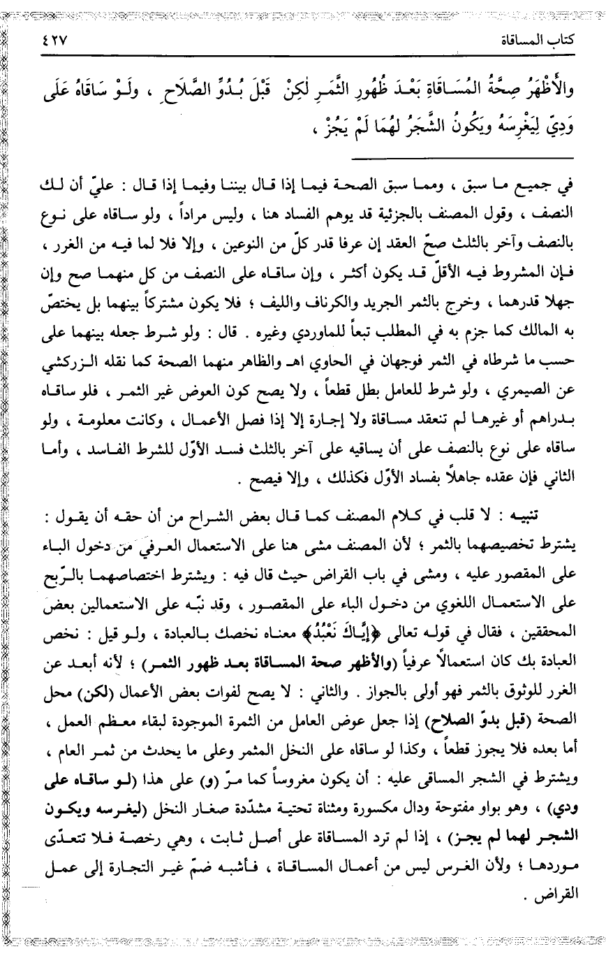 تَنْبِيهٌ لَا قَلْبَ فِي كَلَامِ الْمُصَنِّفِ كَمَا قَالَ بَعْضُ الشُّرَّاحِ مِنْ أَنَّ حَقَّهُ أَنْ يَقُولَ: يُشْتَرَطُ تَخْصِيصُهُمَا بِالثَّمَرِ؛ لِأَنَّ الْمُصَنِّفَ مَشَى هُنَا عَلَى الِاسْتِعْمَالِ الْعُرْفِيِّ مِنْ دُخُولِ الْبَاءِ عَلَى الْمَقْصُورِ عَلَيْهِ، وَمَشَى فِي بَابِ الْقِرَاضِ حَيْثُ قَالَ فِيهِ: وَيُشْتَرَطُ اخْتِصَاصُهُمَا بِالرِّبْحِ عَلَى الِاسْتِعْمَالِ اللُّغَوِيِّ مِنْ دُخُولِ الْبَاءِ عَلَى الْمَقْصُورِ، وَقَدْ نَبَّهَ عَلَى الِاسْتِعْمَالَيْنِ بَعْضُ الْمُحَقِّقِينَ، فَقَالَ فِي قَوْله تَعَالَى: {إِيَّاكَ نَعْبُدُ} [الفاتحة: 5] : مَعْنَاهُ نَخُصُّك بِالْعِبَادَةِ، وَلَوْ قِيلَ: نَخُصُّ الْعِبَادَةَ بِك كَانَ اسْتِعْمَالًا عُرْفِيًّا، (وَالْأَظْهَرُ صِحَّةُ الْمُسَاقَاةِ بَعْدَ ظُهُورِ الثَّمَرِ) ؛ لِأَنَّهُ أَبْعَدُ عَنْ الْغَرَرِ لِلْوُثُوقِ بِالثَّمَرِ فَهُوَ أَوْلَى بِالْجَوَازِ. وَالثَّانِي لَا يَصِحُّ لِفَوَاتِ بَعْضِ الْأَعْمَالِ، (لَكِنَّ) مَحَلَّ الصِّحَّةِ (قَبْل بُدُوِّ الصَّلَاحِ) إذَا جَعَلَ عِوَضَ الْعَامِلِ مِنْ الثَّمَرَةِ الْمَوْجُودَةِ لِبَقَاءِ مُعْظَمِ الْعَمَلِ، أَمَّا بَعْدَهُ فَلَا يَجُوزُ قَطْعًا، وَكَذَا لَوْ سَاقَاهُ عَلَى النَّخْلِ الْمُثْمِرِ وَعَلَى مَا يَحْدُثُ مِنْ ثَمَرِ الْعَامِ، وَيُشْتَرَطُ فِي الشَّجَرِ الْمُسَاقَى عَلَيْهِ: أَنْ يَكُونَ مَغْرُوسًا كَمَا مَرَّ.