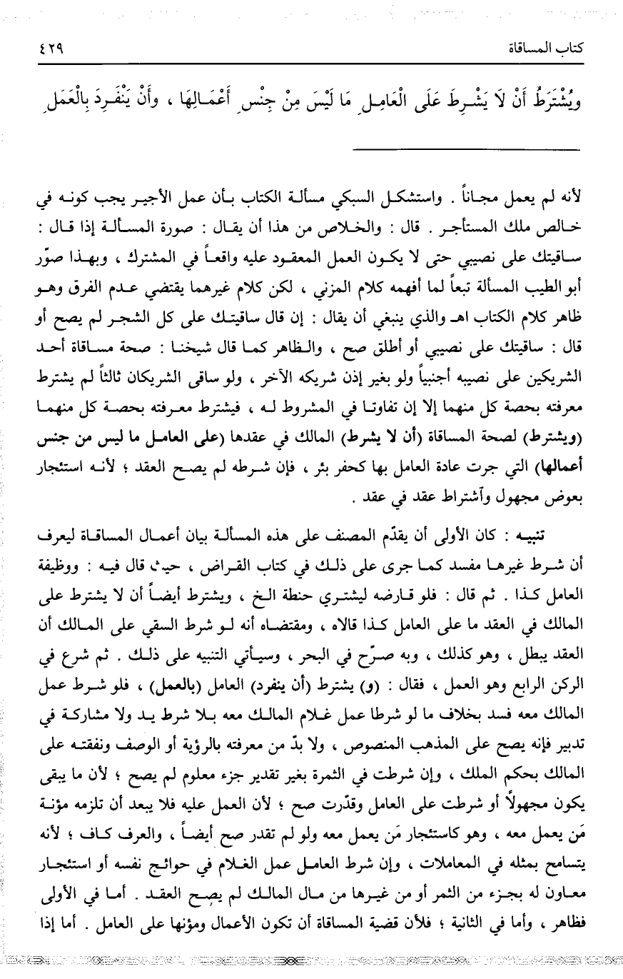 تَنْبِيهٌ كَانَ الْأَوْلَى أَنْ يُقَدِّمَ الْمُصَنِّفُ عَلَى هَذِهِ الْمَسْأَلَةِ بَيَانَ أَعْمَالِ الْمُسَاقَاةِ لِيَعْرِفَ أَنَّ شَرْطَ غَيْرِهَا مُفْسِدٌ، كَمَا جَرَى عَلَى ذَلِكَ فِي كِتَابِ الْقِرَاضِ، حَيْثُ قَالَ فِيهِ: وَوَظِيفَةُ الْعَامِلِ كَذَا. ثُمَّ قَالَ: فَلَوْ قَارَضَهُ لِيَشْتَرِيَ حِنْطَةً إلَخْ. وَيُشْتَرَطُ أَيْضًا أَنْ لَا يَشْتَرِطَ عَلَى الْمَالِكِ فِي الْعَقْدِ مَا عَلَى الْعَامِلِ، كَذَا قَالَاهُ، وَمُقْتَضَاهُ أَنَّهُ لَوْ شَرَطَ السَّقْيَ عَلَى الْمَالِكِ أَنَّ الْعَقْدَ يَبْطُلُ، وَهُوَ كَذَلِكَ، وَبِهِ صَرَّحَ فِي الْبَحْرِ، وَسَيَأْتِي التَّنْبِيهُ عَلَى ذَلِكَ.