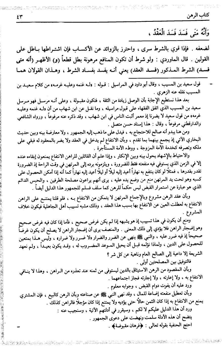 ـــــــــــــــــــــــــــــQلِضَعْفِهِ. فَإِذَا قَوِيَ بِالشَّرْطِ سَرَى، وَاحْتُرِزَ بِالزَّوَائِدِ عَنْ الْأَكْسَابِ فَإِنَّ اشْتِرَاطَهَا بَاطِلٌ عَلَى الْقَوْلَيْنِ. قَالَ الْمَاوَرْدِيُّ: وَلَوْ شُرِطَ أَنْ تَكُونَ الْمَنَافِعُ مَرْهُونَةً بَطَلَ قَطْعًا (وَ) الْأَظْهَرُ (أَنَّهُ مَتَى فَسَدَ) الشَّرْطُ الْمَذْكُورُ (فَسَدَ الْعَقْدُ) يَعْنِي أَنَّهُ يَفْسُدُ بِفَسَادِ الشَّرْطِ، وَهَذَانِ الْقَوْلَانِ هُمَا
