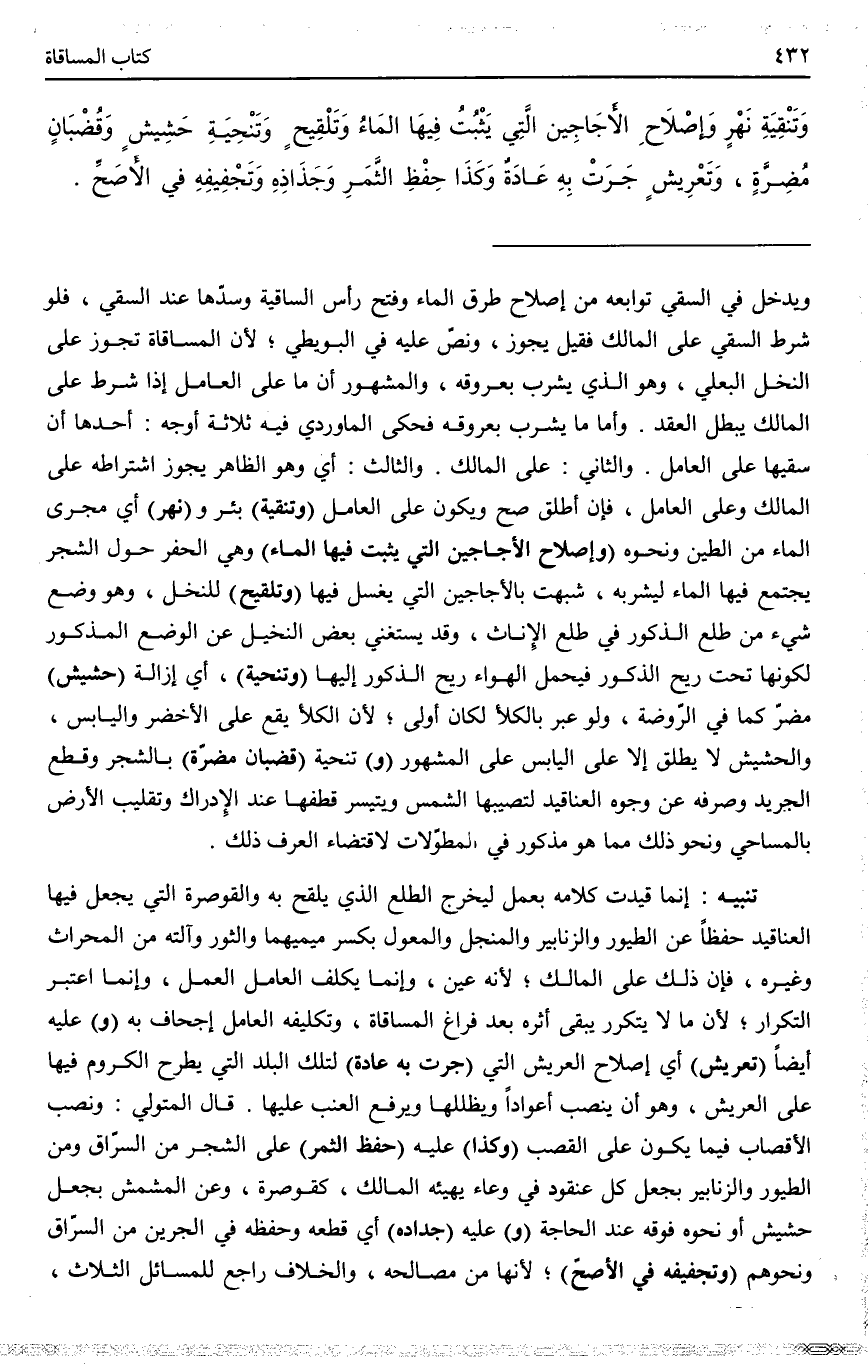 وَالثَّالِثُ أَيْ وَهُوَ الظَّاهِرُ يَجُوزُ اشْتِرَاطُهُ عَلَى الْمَالِكِ وَعَلَى الْعَامِلِ، فَإِنْ أُطْلِقَ صَحَّ وَيَكُونُ عَلَى الْعَامِلِ. (وَتَنْقِيَةُ) بِئْرٍ وَ (نَهْرٍ) أَيْ مَجْرَى الْمَاءِ مِنْ الطِّينِ وَنَحْوِهِ، (وَإِصْلَاحُ الْأَجَاجِينِ الَّتِي يَثْبُتُ فِيهَا الْمَاءُ) وَهِيَ الْحُفَرُ حَوْلَ الشَّجَرِ يَجْتَمِعُ فِيهَا الْمَاءُ لِيَشْرَبَهُ، شُبِّهَتْ بِالْأَجَاجِينِ الَّتِي يُغْسَلُ فِيهَا، (وَتَلْقِيحٌ) لِلنَّخْلِ، وَهُوَ وَضْعُ شَيْءٍ مِنْ طَلْعِ الذُّكُورِ فِي طَلْعِ الْإِنَاثِ، وَقَدْ يَسْتَغْنِي بَعْضُ النَّخِيلِ عَنْ الْوَضْعِ الْمَذْكُورِ لِكَوْنِهَا تَحْتَ رِيحِ الذُّكُورِ فَيَحْمِلُ الْهَوَاءُ رِيحَ الذُّكُورِ إلَيْهَا، (وَتَنْحِيَةُ) ، أَيْ إزَالَةُ (حَشِيشٍ) مُضِرٍّ كَمَا فِي الرَّوْضَةِ، وَلَوْ عَبَّرَ بِالْكَلَأِ لَكَانَ أَوْلَى؛ لِأَنَّ الْكَلَأَ يَقَعُ عَلَى الْأَخْضَرِ وَالْيَابِسِ، وَالْحَشِيشُ لَا يُطْلَقُ إلَّا عَلَى الْيَابِسِ عَلَى الْمَشْهُورِ، (وَ) تَنْحِيَةُ (قُضْبَانٍ مُضِرَّةٍ) بِالشَّجَرِ، وَقَطْعُ الْجَرِيدِ وَصَرْفُهُ عَنْ وُجُوهِ الْعَنَاقِيدِ لِتُصِيبَهَا الشَّمْسُ وَيَتَيَسَّرُ قَطْفُهَا عِنْدَ الْإِدْرَاكِ، وَتَقْلِيبُ الْأَرْضِ بِالْمَسَاحِي وَنَحْوُ ذَلِكَ مِمَّا هُوَ مَذْكُورٌ فِي الْمُطَوَّلَاتِ لِاقْتِضَاءِ الْعُرْفِ ذَلِكَ.