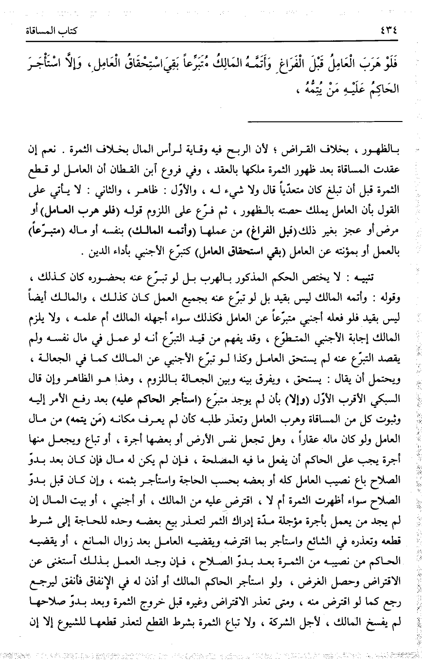 تَنْبِيهٌ لَا يَخْتَصُّ الْحُكْمُ الْمَذْكُورُ بِالْهَرَبِ، بَلْ لَوْ تَبَرَّعَ عَنْهُ بِحُضُورِهِ كَانَ كَذَلِكَ، وَقَوْلُهُ: وَأَتَمَّهُ الْمَالِكُ لَيْسَ بِقَيْدٍ، بَلْ لَوْ تَبَرَّعَ عَنْهُ بِجَمِيعِ الْعَمَلِ كَانَ كَذَلِكَ، وَالْمَالِكُ أَيْضًا لَيْسَ بِقَيْدٍ، فَلَوْ فَعَلَهُ أَجْنَبِيٌّ مُتَبَرِّعًا عَنْ الْعَامِلِ فَكَذَلِكَ، سَوَاءٌ أَجَهِلَهُ الْمَالِكُ أَمْ عَلِمَهُ؟ وَلَا يَلْزَمُ الْمَالِكَ إجَابَةُ الْأَجْنَبِيِّ الْمُتَطَوِّعِ، وَقَدْ يُفْهَمُ مِنْ قَيْدِ التَّبَرُّعِ أَنَّهُ لَوْ عَمِلَ فِي مَالِ نَفْسِهِ وَلَمْ يَقْصِدْ التَّبَرُّعَ عَنْهُ لَمْ يَسْتَحِقَّ الْعَامِلُ، وَكَذَا لَوْ تَبَرَّعَ الْأَجْنَبِيُّ عَنْ الْمَالِكِ كَمَا فِي الْجَعَالَةِ، وَيُحْتَمَلُ أَنْ يُقَالَ: يَسْتَحِقُّ، وَيُفَرَّقُ بَيْنَهُ وَبَيْنَ الْجَعَالَةِ بِاللُّزُومِ، وَهَذَا هُوَ الظَّاهِرُ وَإِنْ قَالَ السُّبْكِيُّ الْأَقْرَبُ الْأَوَّلُ، (وَإِلَّا) بِأَنْ لَمْ يُوجَدْ مُتَبَرِّعٌ (اسْتَأْجَرَ الْحَاكِمُ عَلَيْهِ) بَعْدَ رَفْعِ الْأَمْرِ إلَيْهِ وَثُبُوتِ كُلٍّ مِنْ الْمُسَاقَاةِ وَهَرَبِ الْعَامِلِ وَتَعَذُّرِ طَلَبِهِ، كَأَنْ لَمْ يُعْرَفْ مَكَانُهُ (مَنْ يُتِمُّهُ) مِنْ مَالِ الْعَامِلِ وَلَوْ كَانَ مَالُهُ عَقَارًا، وَهَلْ تُجْعَلُ نَفْسُ الْأَرْضِ أَوْ بَعْضُهَا أُجْرَةً، أَوْ تُبَاعُ وَيُجْعَلُ مِنْهَا أُجْرَةٌ؟ يَجِبُ عَلَى الْحَاكِمِ أَنْ يَفْعَلَ مَا فِيهِ الْمَصْلَحَةُ، فَإِنْ لَمْ يَكُنْ لَهُ مَالٌ فَإِنْ كَانَ بَعْدَ بُدُوِّ الصَّلَاحِ بَاعَ نَصِيبَ الْعَامِلِ كُلَّهُ أَوْ بَعْضَهُ بِحَسَبِ الْحَاجَةِ وَاسْتَأْجَرَ بِثَمَنِهِ، وَإِنْ كَانَ قَبْلَ بُدُوِّ الصَّلَاحِ سَوَاءٌ أَظْهَرَتْ الثَّمَرَةُ أَمْ لَا؟ اقْتَرَضَ عَلَيْهِ مِنْ الْمَالِكِ، أَوْ أَجْنَبِيٍّ، أَوْ بَيْتِ الْمَالِ إنْ لَمْ يَجِدْ مَنْ يَعْمَلُ بِأُجْرَةٍ مُؤَجَّلَةٍ مُدَّةَ إدْرَاكِ الثَّمَرِ لِتَعَذُّرِ بَيْعِ بَعْضِهِ وَحْدَهُ لِلْحَاجَةِ إلَى شَرْطِ قَطْعِهِ وَتَعَذُّرِهِ فِي الشَّائِعِ وَاسْتَأْجَرَ بِمَا اقْتَرَضَهُ، وَيَقْضِيهِ الْعَامِلُ بَعْدَ زَوَالِ الْمَانِعِ، أَوْ يَقْضِيهِ الْحَاكِمُ مِنْ نَصِيبِهِ مِنْ الثَّمَرَةِ بَعْدَ بُدُوِّ الصَّلَاحِ، فَإِنْ وُجِدَ الْعَمَلُ بِذَلِكَ اسْتَغْنَى عَنْ الِاقْتِرَاضِ وَحَصَلَ الْغَرَضُ، وَلَوْ اسْتَأْجَرَ الْحَاكِمُ الْمَالِكَ أَوْ أَذِنَ لَهُ فِي الْإِنْفَاقِ فَأَنْفَقَ لِيَرْجِعَ - رَجَعَ كَمَا لَوْ اقْتَرَضَ مِنْهُ، وَمَتَى تَعَذَّرَ الِاقْتِرَاضُ وَغَيْرُهُ قَبْلَ خُرُوجِ الثَّمَرَةِ وَبَعْدَ بُدُوِّ صَلَاحِهَا لَمْ يَفْسَخْ الْمَالِكُ؛ لِأَجْلِ الشَّرِكَةِ، وَلَا تُبَاعُ الثَّمَرَةُ بِشَرْطِ الْقَطْعِ لِتَعَذُّرِ قَطْعِهَا لِلشُّيُوعِ إلَّا إنْ