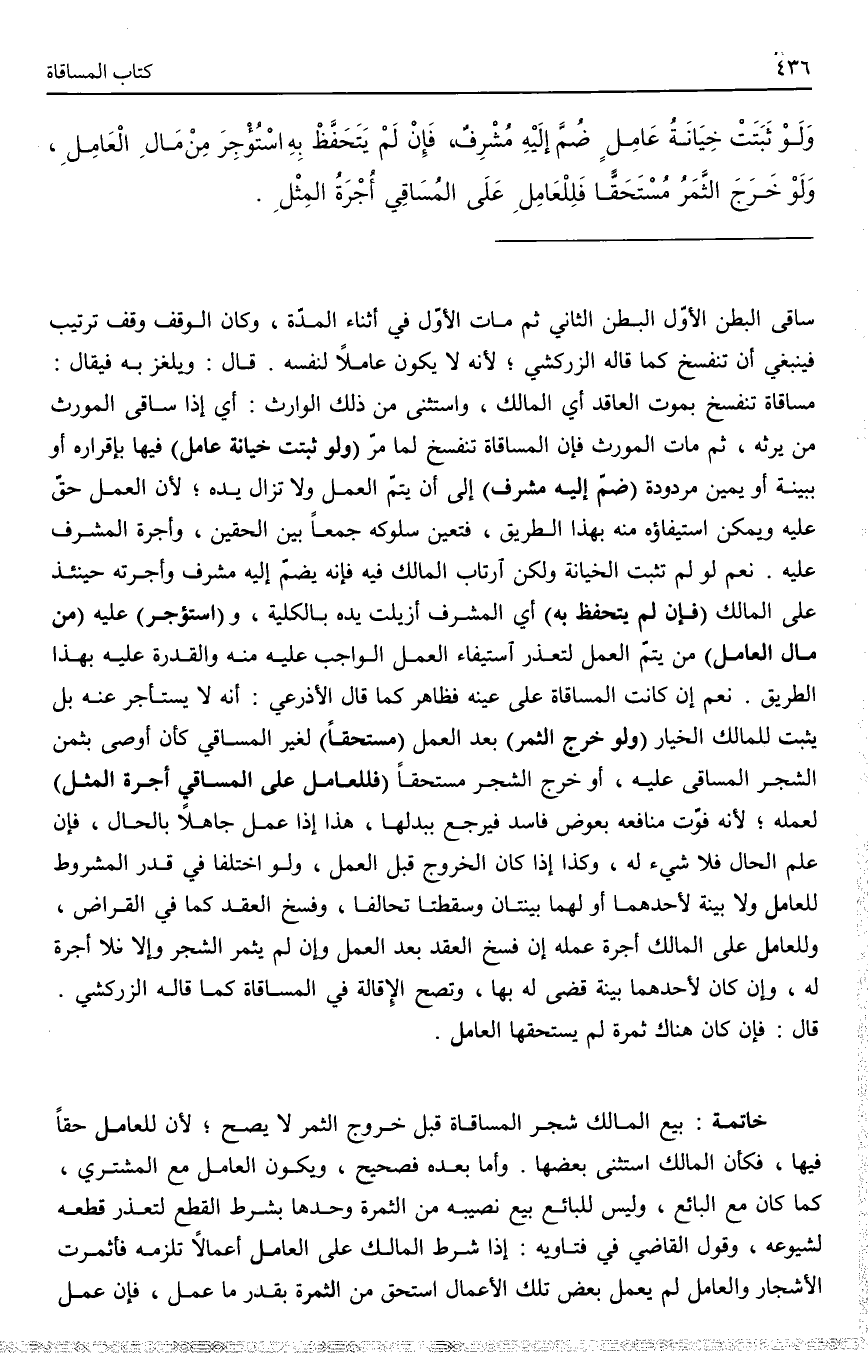 خَاتِمَةٌ بَيْعُ الْمَالِكِ شَجَرَ الْمُسَاقَاةِ قَبْلَ خُرُوجِ الثَّمَرِ لَا يَصِحُّ؛ لِأَنَّ لِلْعَامِلِ حَقًّا فِيهَا، فَكَأَنَّ الْمَالِكَ اسْتَثْنَى بَعْضَهَا. وَأَمَّا بَعْدَهُ فَصَحِيحٌ، وَيَكُونُ الْعَامِلُ مَعَ الْمُشْتَرِي، كَمَا كَانَ مَعَ الْبَائِعِ، وَلَيْسَ لِلْبَائِعِ بَيْعُ نَصِيبِهِ مِنْ الثَّمَرَةِ وَحْدَهَا بِشَرْطِ الْقَطْعِ لِتَعَذُّرِ قَطْعِهِ لِشُيُوعِهِ، وَقَوْلُ الْقَاضِي فِي فَتَاوِيهِ: إذَا شَرَطَ الْمَالِكُ عَلَى الْعَامِلِ أَعْمَالًا تَلْزَمُهُ، فَأَثْمَرَتْ الْأَشْجَارُ وَالْعَامِلُ لَمْ يَعْمَلْ بَعْضَ تِلْكَ الْأَعْمَالِ اسْتَحَقَّ مِنْ الثَّمَرَةِ بِقَدْرِ مَا عَمِلَ، فَإِنْ عَمِلَ