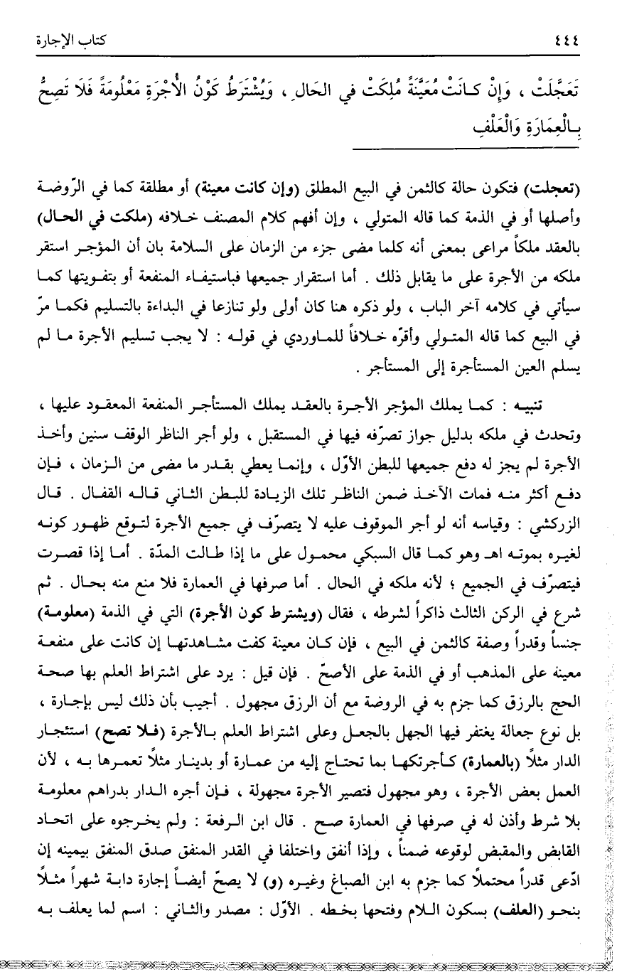 تَنْبِيهٌ كَمَا يَمْلِكُ الْمُؤَجِّرُ الْأُجْرَةَ بِالْعَقْدِ يَمْلِكُ الْمُسْتَأْجِرُ الْمَنْفَعَةَ الْمَعْقُودَ عَلَيْهَا، وَتَحْدُثُ فِي مِلْكِهِ بِدَلِيلِ جَوَازِ تَصَرُّفِهِ فِيهَا فِي الْمُسْتَقْبَلِ، وَلَوْ أَجَرَ النَّاظِرُ الْوَقْفَ سِنِينَ وَأَخَذَ الْأُجْرَةَ لَمْ يَجُزْ لَهُ دَفْعُ جَمِيعِهَا لِلْبَطْنِ الْأَوَّلِ، وَإِنَّمَا يُعْطَى بِقَدْرِ مَا مَضَى مِنْ الزَّمَانِ، فَإِنْ دَفَعَ أَكْثَرَ مِنْهُ فَمَاتَ الْآخِذُ ضَمِنَ النَّاظِرُ تِلْكَ الزِّيَادَةَ لِلْبَطْنِ الثَّانِي. قَالَهُ الْقَفَّالُ. قَالَ الزَّرْكَشِيُّ: وَقِيَاسُهُ أَنَّهُ لَوْ أَجَرَ الْمَوْقُوفَ عَلَيْهِ لَا يَتَصَرَّفُ فِي جَمِيعِ الْأُجْرَةِ لِتَوَقُّعِ ظُهُورِ كَوْنِهِ لِغَيْرِهِ بِمَوْتِهِ. اهـ.