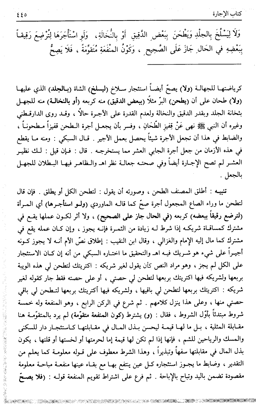 وَالتَّحْقِيقُ مَا اخْتَارَهُ السُّبْكِيُّ مِنْ أَنَّهُ وَإِنْ كَانَ الِاسْتِئْجَارُ عَلَى الْكُلِّ لَمْ يَجُزْ، وَهُوَ مُرَادُ النَّصِّ، كَأَنْ يَقُولَ لِغَيْرِ شَرِيكِهِ: اكْتَرَيْتُكَ لِتَطْحَنَ لِي هَذِهِ الْوَيْبَةَ بِرُبْعِهَا، وَلِشَرِيكِهِ فِيهَا اكْتَرَيْتُكَ بِرُبْعِهَا لِتَطْحَنَ لِي حِصَّتِي، أَوْ عَلَى حِصَّتِهِ فَقَطْ جَارٍ كَقَوْلِهِ لِغَيْرِ شَرِيكِهِ: اكْتَرَيْتُكَ بِرُبْعِهَا لِتَطْحَنَ لِي بَاقِيَهَا، وَلِشَرِيكِهِ فِيهَا اكْتَرَيْتُكَ بِرُبْعِهَا لِتَطْحَنَ لِي بَاقِيَ حِصَّتِي مِنْهَا، وَعَلَى هَذَا يَنْزِلُ كَلَامُهُمْ.