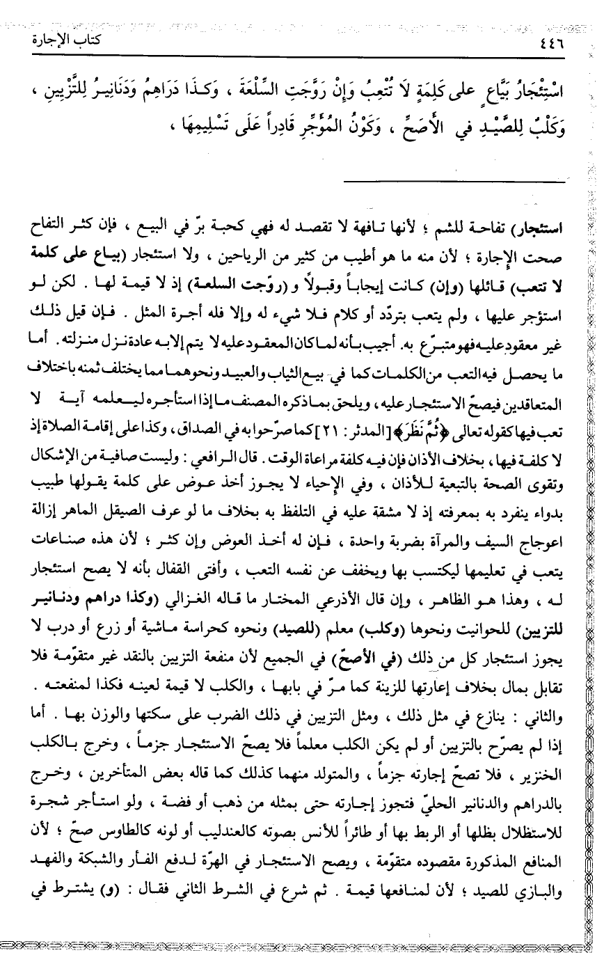 أُجِيبَ بِأَنَّهُ لَمَّا كَانَ الْمَعْقُودُ عَلَيْهِ لَا يَتِمُّ إلَّا بِهِ عَادَةً نَزَلَ مَنْزِلَتَهُ. أَمَّا مَا يَحْصُل فِيهِ التَّعَبُ مِنْ الْكَلِمَاتِ كَمَا فِي بَيْعِ الثِّيَابِ وَالْعَبِيدِ وَنَحْوِهِمَا مِمَّا يَخْتَلِفُ ثَمَنُهُ بِاخْتِلَافِ الْمُتَعَاقِدَيْنِ فَيَصِحُّ الِاسْتِئْجَارُ عَلَيْهِ، وَيَلْحَقُ بِمَا ذَكَرَهُ الْمُصَنِّفُ مَا إذَا اسْتَأْجَرَهُ لِيُعَلِّمَهُ آيَةً لَا تَعَبَ فِيهَا كَقَوْلِهِ تَعَالَى: {ثُمَّ نَظَرَ} [المدثر: 21] ، كَمَا صَرَّحُوا بِهِ فِي الصَّدَاقِ، وَكَذَا عَلَى إقَامَةِ الصَّلَاةِ إذْ لَا كُلْفَةَ فِيهَا، بِخِلَافِ الْأَذَانِ فَإِنَّ فِيهِ كُلْفَةَ مُرَاعَاةِ الْوَقْتِ. قَالَ الرَّافِعِيُّ: وَلَيْسَتْ صَافِيَةً مِنْ الْإِشْكَالِ، وَتَقْوَى الصِّحَّةُ بِالتَّبَعِيَّةِ لِلْأَذَانِ، وَفِي الْإِحْيَاءِ لَا يَجُوزُ أَخْذُ عِوَضٍ عَلَى كَلِمَةٍ يَقُولُهَا طَبِيبٌ بِدَوَاءٍ يَنْفَرِدُ بِهِ بِمَعْرِفَتِهِ، إذْ لَا مَشَقَّةَ عَلَيْهِ فِي التَّلَفُّظِ بِهِ، بِخِلَافِ مَا لَوْ عَرَفَ الصَّيْقَلُ الْمَاهِرُ إزَالَةَ اعْوِجَاجِ السَّيْفِ وَالْمِرْآةِ بِضَرْبَةٍ وَاحِدَةٍ، فَإِنَّ لَهُ أَخْذَ الْعِوَضِ وَإِنْ كَثُرَ؛ لِأَنَّ هَذِهِ صِنَاعَاتٌ يَتْعَبُ فِي تَعْلِيمِهَا لِيَكْتَسِبَ بِهَا وَيُخَفِّفَ عَنْ نَفْسِهِ التَّعَبَ، وَأَفْتَى الْقَفَّالُ بِأَنَّهُ لَا يَصِحُّ اسْتِئْجَارٌ لَهُ، وَهَذَا هُوَ الظَّاهِرُ، وَإِنْ قَالَ الْأَذْرَعِيُّ الْمُخْتَارُ مَا قَالَهُ الْغَزَالِيُّ، (وَكَذَا دَرَاهِمُ وَدَنَانِيرُ لِلتَّزْيِينِ) لِلْحَوَانِيتِ وَنَحْوِهَا، (وَكَلْبٌ) مُعَلَّمٌ (لِلصَّيْدِ) وَنَحْوِهِ كَحِرَاسَةِ مَاشِيَةٍ أَوْ زَرْعٍ أَوْ دَرْبٍ لَا يَجُوزُ اسْتِئْجَارُ كُلٍّ مِنْ ذَلِكَ (فِي الْأَصَحِّ) فِي الْجَمِيعِ؛ لِأَنَّ مَنْفَعَةَ التَّزْيِينِ بِالنَّقْدِ غَيْرُ مُتَقَوِّمَةٍ فَلَا تُقَابَلُ بِمَالٍ بِخِلَافِ إعَارَتِهَا لِلزِّينَةِ كَمَا مَرَّ فِي بَابِهَا، وَالْكَلْبُ لَا قِيمَةَ لِعَيْنِهِ فَكَذَا لِمَنْفَعَتِهِ. وَالثَّانِي: يُنَازِعُ فِي مِثْلِ ذَلِكَ، وَمِثْلُ التَّزْيِينِ فِي ذَلِكَ الضَّرْبُ عَلَى سِكَّتِهَا وَالْوَزْنُ بِهَا، أَمَّا إذَا لَمْ يُصَرِّحْ بِالتَّزْيِينِ أَوْ لَمْ يَكُنْ الْكَلْبُ مُعَلَّمًا فَلَا يَصِحُّ الِاسْتِئْجَارُ جَزْمًا، وَخَرَجَ بِالْكَلْبِ الْخِنْزِيرُ، فَلَا تَصِحُّ إجَارَتُهُ جَزْمًا، وَالْمُتَوَلَّدُ مِنْهُمَا كَذَلِكَ كَمَا قَالَهُ بَعْضُ الْمُتَأَخِّرِينَ، وَخَرَجَ بِالدَّرَاهِمِ وَالدَّنَانِيرِ الْحُلِيُّ فَتَجُوزُ إجَارَتُهُ حَتَّى بِمِثْلِهِ مِنْ ذَهَبٍ أَوْ فِضَّةٍ، وَلَوْ اسْتَأْجَرَ شَجَرَةً لِلِاسْتِظْلَالِ بِظِلِّهَا أَوْ الرَّبْطِ بِهَا، أَوْ طَائِرًا لِلْأُنْسِ بِصَوْتِهِ كَالْعَنْدَلِيبِ أَوْ لَوْنِهِ كَالطَّاوُسِ صَحَّ؛ لِأَنَّ الْمَنَافِعَ الْمَذْكُورَةَ مَقْصُودَةٌ مُتَقَوِّمَةٌ، وَيَصِحُّ الِاسْتِئْجَارُ فِي الْهِرَّةِ لِدَفْعِ الْفَأْرِ، وَالشَّبَكَةِ وَالْفَهْدِ وَالْبَازِي لِلصَّيْدِ؛ لِأَنَّ لِمَنَافِعِهَا قِيمَةً.
