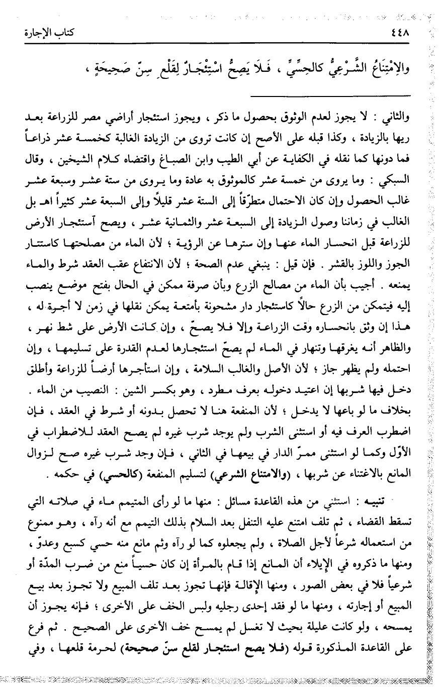 بَلْ الْغَالِبُ فِي زَمَانِنَا وُصُولُ الزِّيَادَةِ إلَى السَّبْعَةَ عَشَرَ وَالثَّمَانِيَةَ عَشَرَ، وَيَصِحُّ اسْتِئْجَارُ الْأَرْضِ لِلزِّرَاعَةِ قَبْلَ انْحِسَارِ الْمَاءِ عَنْهَا وَإِنْ سَتَرَهَا عَنْ الرُّؤْيَةِ؛ لِأَنَّ الْمَاءَ مِنْ مَصْلَحَتِهَا كَاسْتِتَارِ الْجَوْزِ وَاللَّوْزِ بِالْقِشْرِ. فَإِنْ قِيلَ: يَنْبَغِي عَدَمُ الصِّحَّةِ؛ لِأَنَّ الِانْتِفَاعَ عَقِبَ الْعَقْدِ شَرْطٌ وَالْمَاءُ يَمْنَعْهُ.
