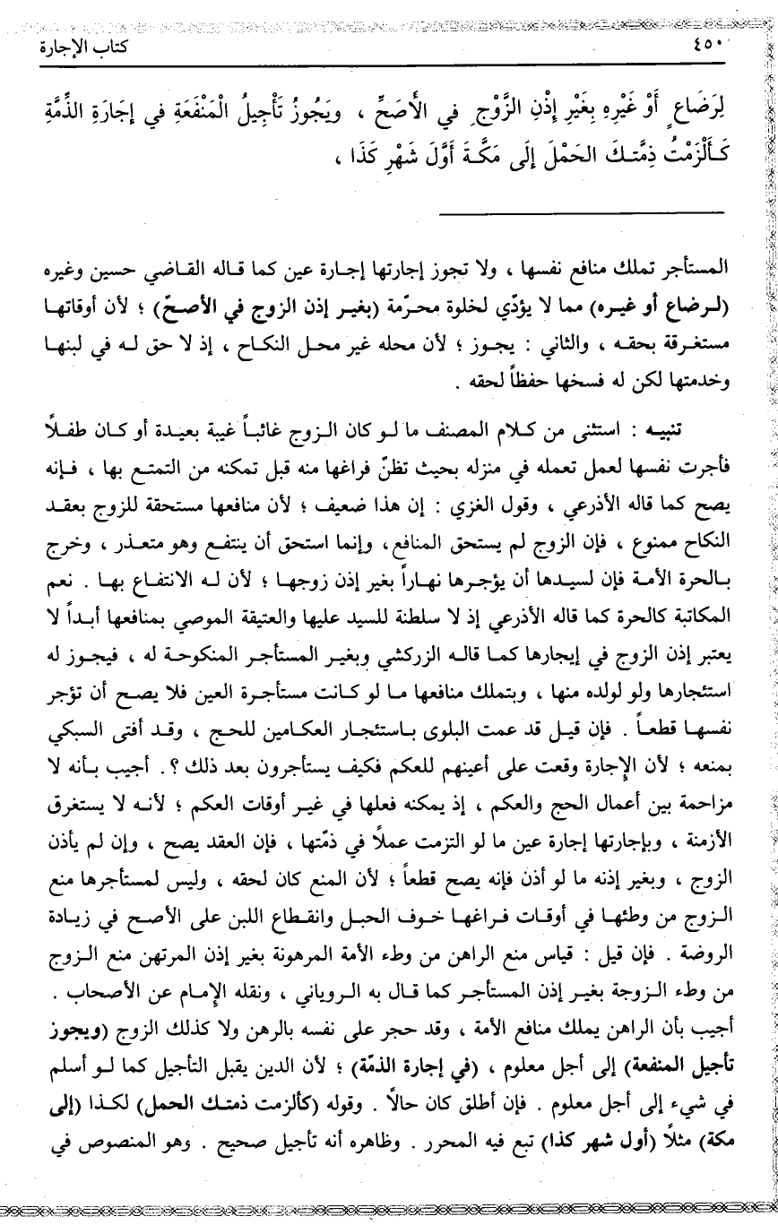 أُجِيبَ بِأَنَّهُ لَا مُزَاحَمَةَ بَيْنَ أَعْمَالِ الْحَجِّ وَالْعَكْمِ إذْ يُمْكِنُهُ فِعْلُهَا فِي غَيْرِ أَوْقَاتِ الْعَكْمِ؛ لِأَنَّهُ لَا يَسْتَغْرِقُ الْأَزْمِنَةَ. وَبِإِجَارَتِهَا إجَارَةَ عَيْنٍ مَا لَوْ الْتَزَمَتْ عَمَلًا فِي ذِمَّتِهَا، فَإِنَّ الْعَقْدَ يَصِحُّ، وَإِنْ لَمْ يَأْذَنْ الزَّوْجُ، وَبِغَيْرِ إذْنِهِ مَا لَوْ أَذِنَ فَإِنَّهُ يَصِحُّ قَطْعًا؛ لِأَنَّ الْمَنْعَ كَانَ لِحَقِّهِ، وَلَيْسَ لِمُسْتَأْجِرِهَا مَنْعُ الزَّوْجِ مِنْ وَطْئِهَا فِي أَوْقَاتِ فَرَاغِهَا خَوْفَ الْحَبَلِ وَانْقِطَاعِ اللَّبَنِ عَلَى الْأَصَحِّ فِي زِيَادَةِ الرَّوْضَةِ. فَإِنْ قِيلَ: قِيَاسُ مَنْعِ الرَّاهِنِ مِنْ وَطْءِ الْأَمَةِ الْمَرْهُونَةِ بِغَيْرِ إذْنِ الْمُرْتَهِنِ مَنْعُ الزَّوْجِ مِنْ وَطْءِ الزَّوْجَةِ بِغَيْرِ إذْنِ الْمُسْتَأْجِرِ كَمَا قَالَ بِهِ الرُّويَانِيُّ، وَنَقَلَهُ الْإِمَامُ عَنْ الْأَصْحَابِ. .