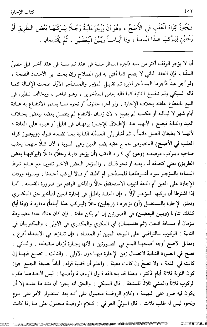 ـــــــــــــــــــــــــــــQأَنْ لَا يُؤَجِّرَ الْوَقْفَ أَكْثَرَ مِنْ سَنَةٍ فَأَجَّرَهُ النَّاظِرُ سَنَةً فِي عَقْدٍ، ثُمَّ سَنَةً فِي عَقْدٍ آخَرَ قَبْلَ مُضِيِّ الْمُدَّةِ، فَإِنَّ الْعَقْدَ الثَّانِيَ لَا يَصِحُّ كَمَا أَفْتَى بِهِ ابْنُ الصَّلَاحِ وَإِنْ بَحَثَ ابْنُ الْأُسْتَاذِ الصِّحَّةَ، وَلَوْ أَجَّرَ عَيْنًا فَأَجَّرَهَا الْمُسْتَأْجِرُ لِغَيْرِهِ ثُمَّ تَقَايَلَ الْمُؤَجِّرُ وَالْمُسْتَأْجِرُ الْأَوَّلُ - صَحَّتْ الْإِقَالَةُ كَمَا قَالَهُ السُّبْكِيُّ، وَلَمْ تَنْفَسِخْ الثَّانِيَةُ كَمَا قَالَهُ بَعْضُ الْمُتَأَخِّرِينَ، وَهُوَ ظَاهِرٌ، وَيُخَالِفُ نَظِيرَهُ فِي الْبَيْعِ بِانْقِطَاعِ عُلْقَتِهِ بِخِلَافِ الْإِجَارَةِ، وَلَوْ أَجَرَهُ حَانُوتًا أَوْ نَحْوَهُ، مِمَّا يَسْتَمِرُّ الِانْتِفَاعُ بِهِ عَادَةً أَيَّامَ شَهْرٍ لَا لَيَالِيِهِ أَوْ عَكَسَهُ لَمْ يَصِحَّ؛ لِأَنَّ زَمَانَ الِانْتِفَاعِ لَمْ يَتَّصِلْ بَعْضُهُ بِبَعْضٍ بِخِلَافِ الْعَبْدِ وَالدَّابَّةِ فَيَصِحُّ؛ لِأَنَّهُمَا عِنْدَ الْإِطْلَاقِ لِلْإِجَارَةِ يُرَفَّهَانِ فِي اللَّيْلِ أَوْ غَيْرِهِ عَلَى الْعَادَةِ؛ لِأَنَّهُمَا لَا يُطِيقَانِ الْعَمَلَ دَائِمًا، ثُمَّ أَشَارَ إلَى الْمَسْأَلَةِ الثَّانِيَةِ بِمَا تَضَمَّنَهُ قَوْلُهُ: (وَيَجُوزُ كِرَاءُ الْعُقَبِ فِي الْأَصَحِّ) الْمَنْصُوصِ جَمْعُ عُقْبَةٍ بِضَمِّ الْعَيْنِ وَهِيَ النَّوْبَةُ؛ لِأَنَّ كُلًّا مِنْهُمَا يَعْقُبُ صَاحِبَهُ وَيَرْكَبُ مَوْضِعَهُ (وَهُوَ) أَيْ كِرَاءُ الْعُقَبِ فِي (أَنْ يُؤَجِّرَ دَابَّةً رَجُلًا) مَثَلًا (لِيَرْكَبَهَا بَعْضَ الطَّرِيقِ) يَعْنِي كَنِصْفِهِ أَوْ رُبْعِهِ أَوْ نَحْوِ ذَلِكَ، وَالْمُؤَجِّرُ الْبَعْضَ الْآخَرَ تَنَاوُبًا مَعَ عَدَمِ شَرْطِ الْبُدَاءَةِ بِالْمُؤَجِّرِ، سَوَاءٌ أَشَرَطَاهَا لِلْمُسْتَأْجِرِ أَمْ أَطْلَقَا أَوْ قَالَا لِيَرْكَبْ أَحَدُنَا، وَسَوَاءٌ وَرَدَتْ الْإِجَارَةُ عَلَى الْعَيْنِ أَمْ الذِّمَّةِ لِثُبُوتِ الِاسْتِحْقَاقِ حَالًا، وَالتَّأْخِيرُ الْوَاقِعُ مِنْ ضَرُورَةِ الْقِسْمَةِ. أَمَّا إذَا اشْتَرَطَا أَنْ يَرْكَبَهَا الْمُؤَجِّرُ أَوَّلًا فَإِنَّ الْعَقْدَ بَاطِلٌ فِي إجَارَةِ الْعَيْنِ لِتَأْخِيرِ حَقِّ الْمُكْتَرِي وَتَعَلُّقِ الْإِجَارَةِ بِالْمُسْتَقْبَلِ، (أَوْ) يُؤَجِّرَهَا (رَجُلَيْنِ) مَثَلًا (لِيَرْكَبَ هَذَا أَيَّامًا) مَعْلُومَةً (وَذَا أَيَّامًا) كَذَلِكَ تَنَاوُبًا، (وَيُبَيِّنُ الْبَعْضَيْنِ) فِي الصُّورَتَيْنِ إنْ لَمْ يَكُنْ عَادَةٌ، فَإِنْ كَانَ هُنَاكَ عَادَةً مَضْبُوطَةً بِزَمَانٍ أَوْ مَسَافَةٍ اُتُّبِعَتْ، (ثُمَّ يَقْتَسِمَانِ) أَيْ الْمُكْرِي وَالْمُكْتَرِي فِي الْأُولَى، وَالْمُكْتَرِيَانِ فِي الثَّانِيَةِ: الرُّكُوبَ بِالتَّرَاضِي عَلَى الْوَجْهِ الْمُبَيَّنِ أَوْ الْمُعْتَادِ، فَإِنْ تَنَازَعَا فِي الِابْتِدَاءِ أُقْرِعَ، وَمُقَابِلُ الْأَصَحِّ أَوْجُهٌ أَصَحُّهَا الْمَنْعُ فِي الصُّورَتَيْنِ؛ لِأَنَّهَا إجَارَةُ أَزْمَانٍ مُنْقَطِعَةٌ.