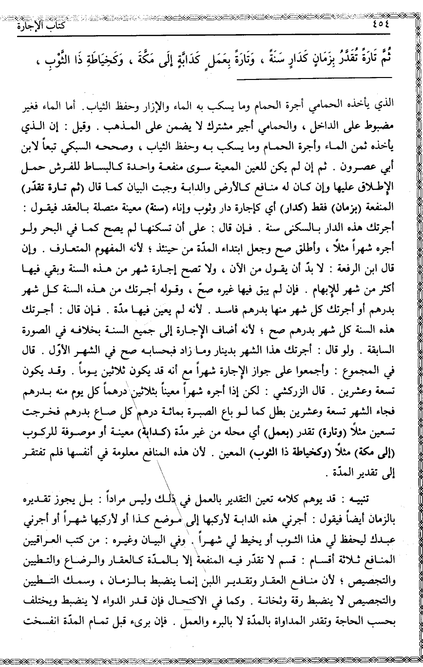 تَنْبِيهٌ قَدْ يُوهِمُ كَلَامُهُ تَعَيُّنَ التَّقْدِيرِ بِالْعَمَلِ فِي ذَلِكَ وَلَيْسَ مُرَادًا، بَلْ يَجُوزُ تَقْدِيرُهُ بِالزَّمَنِ أَيْضًا فَيَقُولُ: أَجِّرْنِي هَذِهِ الدَّابَّةَ لِأَرْكَبَهَا إلَى مَوْضِعِ كَذَا، أَوْ لِأَرْكَبَهَا شَهْرًا، أَوْ أَجِّرْنِي عَبْدَك لِيَحْفَظَ لِي هَذَا الثَّوْبَ أَوْ يَخِيطَ لِي شَهْرًا.