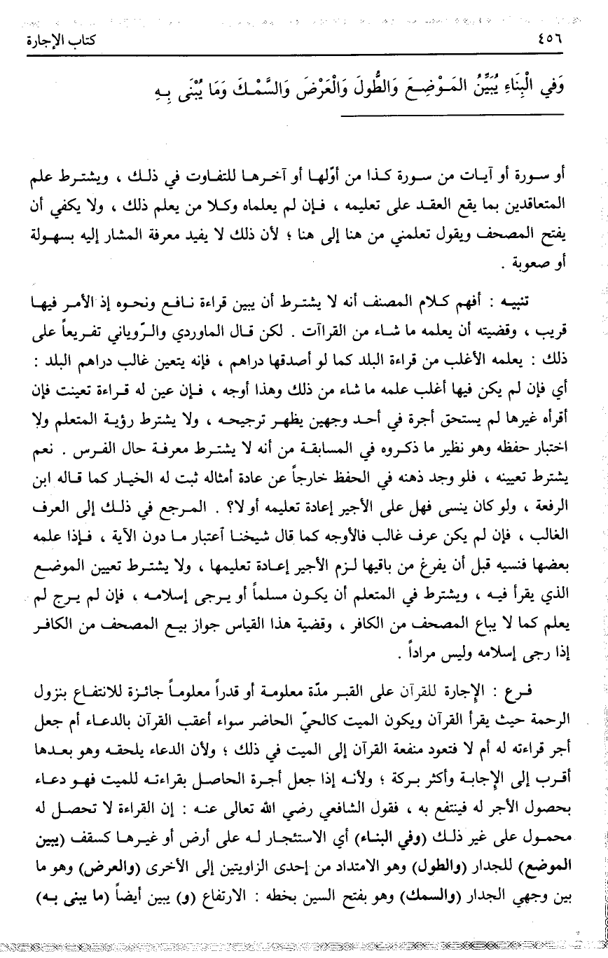 فَرْعٌ الْإِجَارَةُ لِلْقُرْآنِ عَلَى الْقَبْرِ مُدَّةً مَعْلُومَةً أَوْ قَدْرًا مَعْلُومًا جَائِزَةٌ لِلِانْتِفَاعِ بِنُزُولِ الرَّحْمَةِ حَيْثُ يُقْرَأُ الْقُرْآنُ وَيَكُونُ الْمَيِّتُ كَالْحَيِّ الْحَاضِرِ، سَوَاءٌ أَعْقَبَ الْقُرْآنَ بِالدُّعَاءِ أَمْ جَعَلَ أَجْرَ قِرَاءَتِهِ لَهُ أَمْ لَا، فَتَعُودُ مَنْفَعَةُ الْقُرْآنِ إلَى الْمَيِّتِ فِي ذَلِكَ؛ وَلِأَنَّ الدُّعَاءَ يَلْحَقُهُ وَهُوَ بَعْدَهَا أَقْرَبُ إلَى الْإِجَابَةِ وَأَكْثَرُ بَرَكَةً؛ وَلِأَنَّهُ إذَا جَعَلَ أُجْرَةَ الْحَاصِلِ بِقِرَاءَتِهِ لِلْمَيِّتِ فَهُوَ دُعَاءٌ بِحُصُولِ الْأَجْرِ لَهُ فَيَنْتَفِعُ بِهِ، فَقَوْلُ الشَّافِعِيِّ - رَضِيَ اللَّهُ تَعَالَى عَنْهُ -: إنَّ الْقِرَاءَةَ لَا تَحْصُلُ لَهُ مَحْمُولٌ عَلَى غَيْرِ ذَلِكَ.