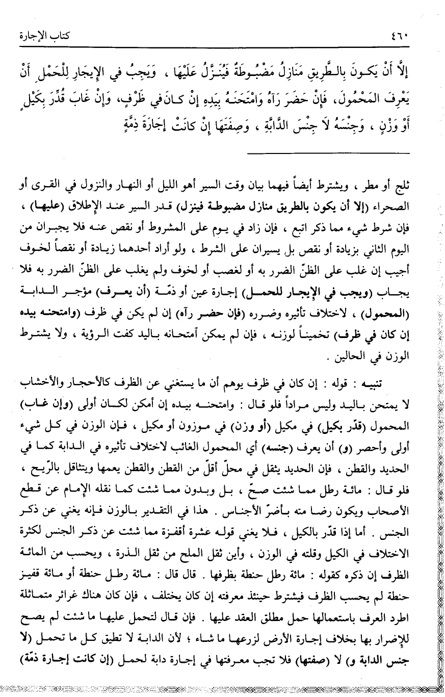 وَيَجِبُ فِي الْإِيجَارِ لِلْحَمْلِ أَنْ يَعْرِفَ الْمَحْمُولَ، فَإِنْ حَضَرَ رَآهُ وَامْتَحَنَهُ بِيَدِهِ إنْ كَانَ فِي ظَرْفٍ، وَإِنْ غَابَ قُدِّرَ بِكَيْلٍ أَوْ وَزْنٍ، وَجِنْسُهُ لَا جِنْسَ الدَّابَّةِ، وَصِفَتَهَا إنْ كَانَتْ إجَارَةَ ذِمَّةٍ