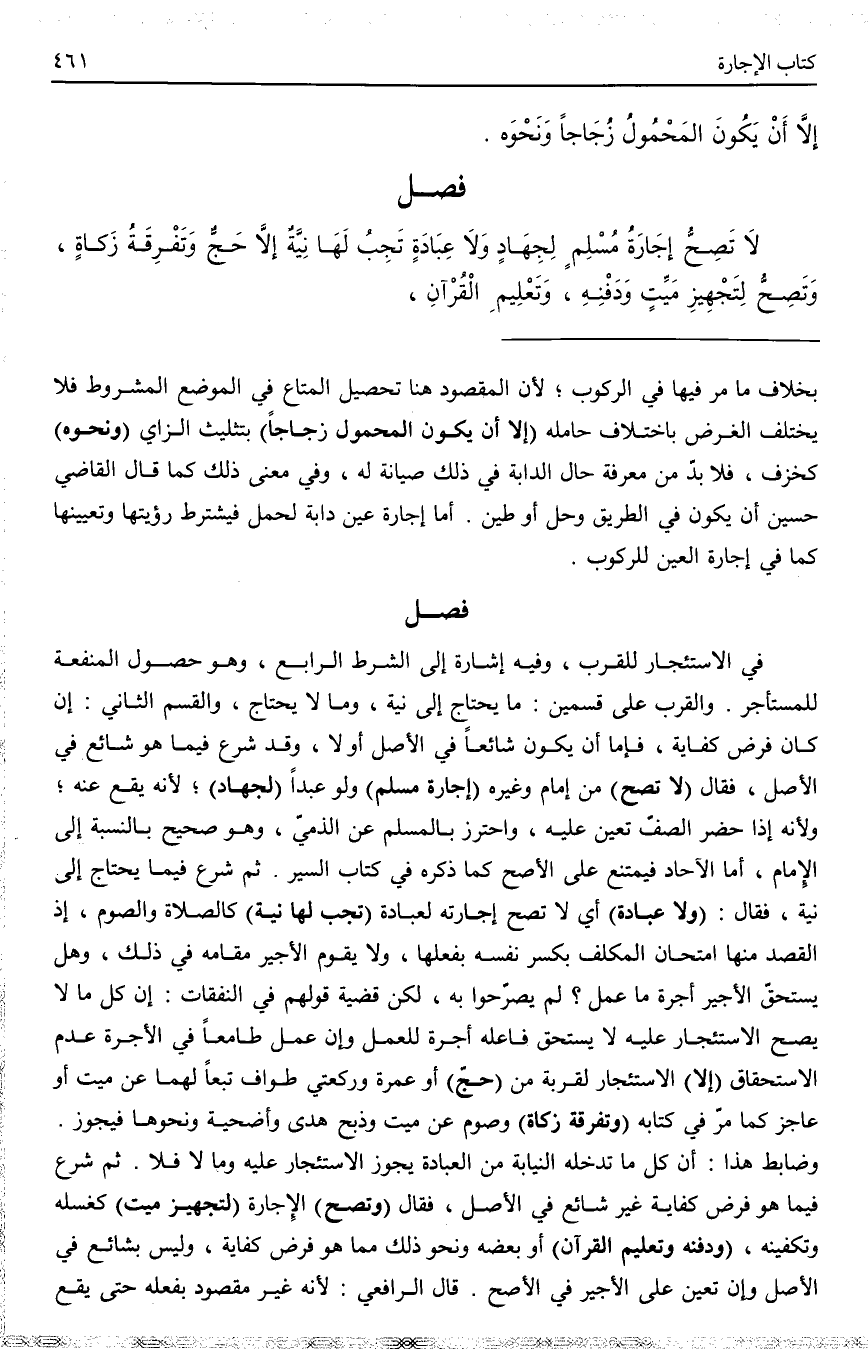 ِ وَفِيهِ إشَارَةٌ إلَى الشَّرْطِ الرَّابِعِ، وَهُوَ حُصُولُ الْمَنْفَعَةِ لِلْمُسْتَأْجِرِ. وَالْقُرَبُ عَلَى قِسْمَيْنِ: مَا يَحْتَاجُ إلَى نِيَّةٍ، وَمَا لَا يَحْتَاجُ، وَالْقِسْمُ الثَّانِي إنْ كَانَ فَرْضَ كِفَايَةٍ، فَإِمَّا أَنْ يَكُونَ شَائِعًا فِي الْأَصْلِ أَوْ لَا، وَقَدْ شَرَعَ فِيمَا هُوَ شَائِعٌ فِي الْأَصْلِ، فَقَالَ: (لَا تَصِحُّ) مِنْ إمَامٍ وَغَيْرِهِ (إجَارَةُ مُسْلِمٍ) وَلَوْ عَبْدًا (لِجِهَادٍ) ؛ لِأَنَّهُ يَقَعُ عَنْهُ؛ وَلِأَنَّهُ إذَا حَضَرَ الصَّفَّ تَعَيَّنَ عَلَيْهِ، وَاحْتُرِزَ بِالْمُسْلِمِ عَنْ الذِّمِّيِّ، وَهُوَ صَحِيحٌ بِالنِّسْبَةِ إلَى الْإِمَامِ، أَمَّا الْآحَادُ فَيُمْتَنَعُ عَلَى الْأَصَحِّ كَمَا ذَكَرَهُ فِي كِتَابِ السِّيَرِ. ثُمَّ شَرَعَ فِيمَا يَحْتَاجُ إلَى نِيَّةٍ، فَقَالَ: (وَلَا عِبَادَةٍ) أَيْ لَا تَصِحُّ إجَارَتُهُ لِعِبَادَةٍ (تَجِبُ لَهَا نِيَّةٌ) كَالصَّلَاةِ وَالصَّوْمِ، إذْ الْقَصْدُ مِنْهَا امْتِحَانُ الْمُكَلَّفِ بِكَسْرِ نَفْسِهِ بِفِعْلِهَا، وَلَا يَقُومُ الْأَجِيرُ مَقَامَهُ فِي ذَلِكَ، وَهَلْ يَسْتَحِقُّ الْأَجِيرُ أُجْرَةَ مَا عَمِلَ؟ لَمْ يُصَرِّحُوا بِهِ، لَكِنَّ قَضِيَّةَ قَوْلِهِمْ فِي النَّفَقَاتِ أَنَّ كُلَّ مَا لَا يَصِحُّ الِاسْتِئْجَارُ عَلَيْهِ لَا يَسْتَحِقُّ فَاعِلُهُ أُجْرَةً لِلْعَمَلِ وَإِنْ عَمِلَ طَامِعًا فِي الْأُجْرَةِ عُدِمَ الِاسْتِحْقَاقُ، (إلَّا) الِاسْتِئْجَارَ لِقُرْبَةٍ مِنْ (حَجٍّ) أَوْ عُمْرَةٍ، وَرَكْعَتَيْ طَوَافٍ تَبَعًا لَهُمَا عَنْ مَيِّتٍ أَوْ عَاجِزٍ كَمَا مَرَّ فِي كِتَابِهِ، (وَتَفْرِقَةِ زَكَاةٍ) وَصَوْمٍ عَنْ مَيِّتٍ وَذَبْحِ هَدْيٍ وَأُضْحِيَّةٍ وَنَحْوِهَا فَيَجُوزُ. وَضَابِطُ هَذَا: أَنَّ كُلَّ مَا تَدْخُلُهُ النِّيَابَةُ مِنْ الْعِبَادَةِ يَجُوزُ الِاسْتِئْجَارُ عَلَيْهِ، وَمَا لَا فَلَا. ثُمَّ شَرَعَ فِيمَا هُوَ فَرْضُ كِفَايَةٍ غَيْرُ شَائِعٍ فِي الْأَصْلِ، فَقَالَ: (وَتَصِحُّ) الْإِجَارَةُ (لِتَجْهِيزِ مَيِّتٍ) كَغُسْلِهِ وَتَكْفِينِهِ (وَدَفْنِهِ وَتَعْلِيمِ الْقُرْآنِ) أَوْ بَعْضِهِ وَنَحْوِ ذَلِكَ مِمَّا هُوَ فَرْضُ كِفَايَةٍ، وَلَيْسَ بِشَائِعٍ فِي الْأَصْلِ، وَإِنْ تَعَيَّنَ عَلَى الْأَجِيرِ فِي الْأَصَحِّ. قَالَ الرَّافِعِيُّ: لِأَنَّهُ غَيْرُ مَقْصُودٍ بِفِعْلِهِ حَتَّى يَقَعَ
