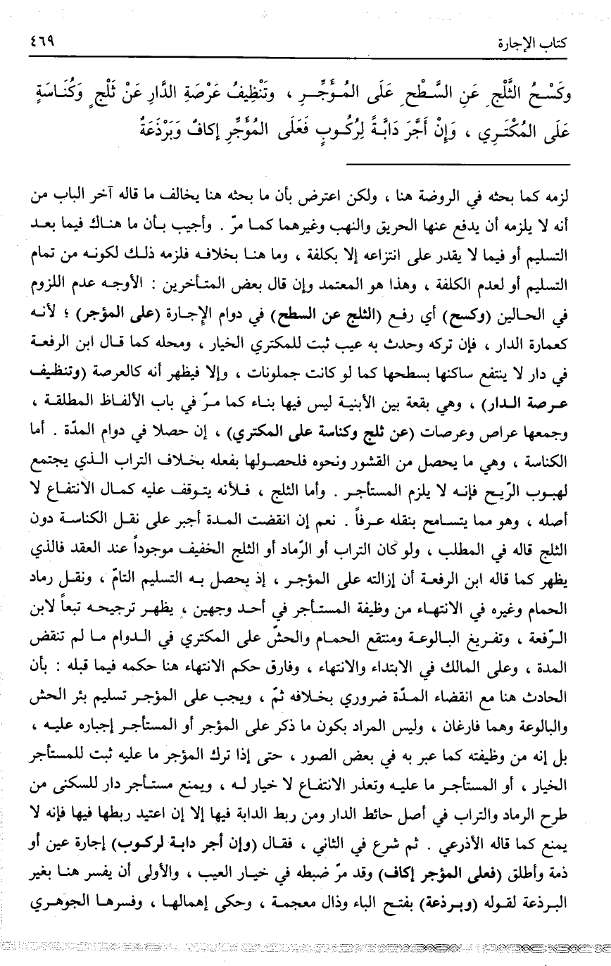 وَكَسْحُ الثَّلْجِ عَنْ السَّطْحِ عَلَى الْمُؤَجِّرِ، وَتَنْظِيفُ عَرْصَةِ الدَّارِ عَنْ ثَلْجٍ وَكُنَاسَةٍ عَلَى الْمُكْتَرِي.