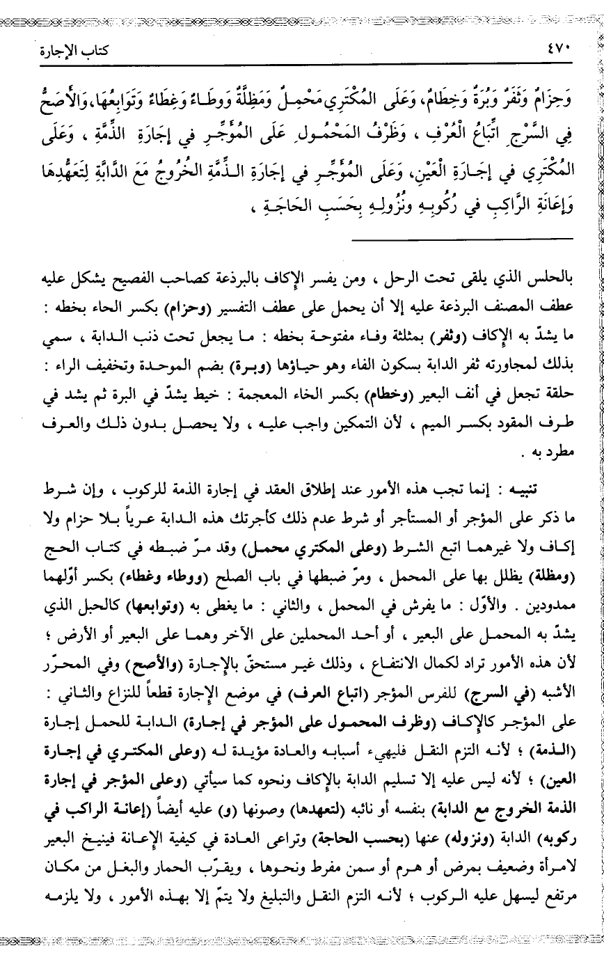 تَنْبِيهٌ إنَّمَا تَجِبُ هَذِهِ الْأُمُورُ عِنْدَ إطْلَاقِ الْعَقْدِ فِي إجَارَةِ الذِّمَّةِ لِلرُّكُوبِ، وَإِنْ شَرَطَ مَا ذُكِرَ عَلَى الْمُؤَجِّرِ أَوْ الْمُسْتَأْجِرِ أَوْ شَرَطَ عَدَمَ ذَلِكَ كَأَجَّرْتُكَ هَذِهِ الدَّابَّةَ عُرْيًا بِلَا حِزَامٍ وَلَا إكَافٍ وَلَا غَيْرِهِمَا اُتُّبِعَ الشَّرْطُ، (وَعَلَى الْمُكْتَرِي مَحْمِلٌ) وَقَدْ مَرَّ ضَبْطُهُ فِي كِتَابِ الْحَجِّ (وَمِظَلَّةٌ) يُظَلَّلُ بِهَا عَلَى الْمَحْمِلِ، وَمَرَّ ضَبْطُهَا فِي بَابِ الصُّلْحِ، (وَوِطَاءٌ وَغِطَاءٌ) بِكَسْرِ أَوَّلِهِمَا مَمْدُودَيْنِ. وَالْأَوَّلُ: مَا يُفْرَشُ فِي الْمَحْمِلِ، وَالثَّانِي مَا يُغَطَّى بِهِ، (وَتَوَابِعُهَا) كَالْحَبْلِ الَّذِي يُشَدُّ بِهِ الْمَحْمِلُ عَلَى الْبَعِيرِ، أَوْ أَحَدِ الْمَحْمِلَيْنِ عَلَى الْآخَرِ وَهُمَا عَلَى الْبَعِيرِ أَوْ الْأَرْضِ؛ لِأَنَّ هَذِهِ الْأُمُورَ تُرَادُ لِكَمَالِ الِانْتِفَاعِ، وَذَلِكَ غَيْرُ مُسْتَحَقٍّ بِالْإِجَارَةِ، (وَالْأَصَحُّ) وَفِي الْمُحَرَّرِ الْأَشْبَهُ (فِي السَّرْجِ) لِلْفَرَسِ الْمُؤَجَّرِ (اتِّبَاعُ الْعُرْفِ) فِي مَوْضِعِ الْإِجَارَةِ قَطْعًا لِلنِّزَاعِ.