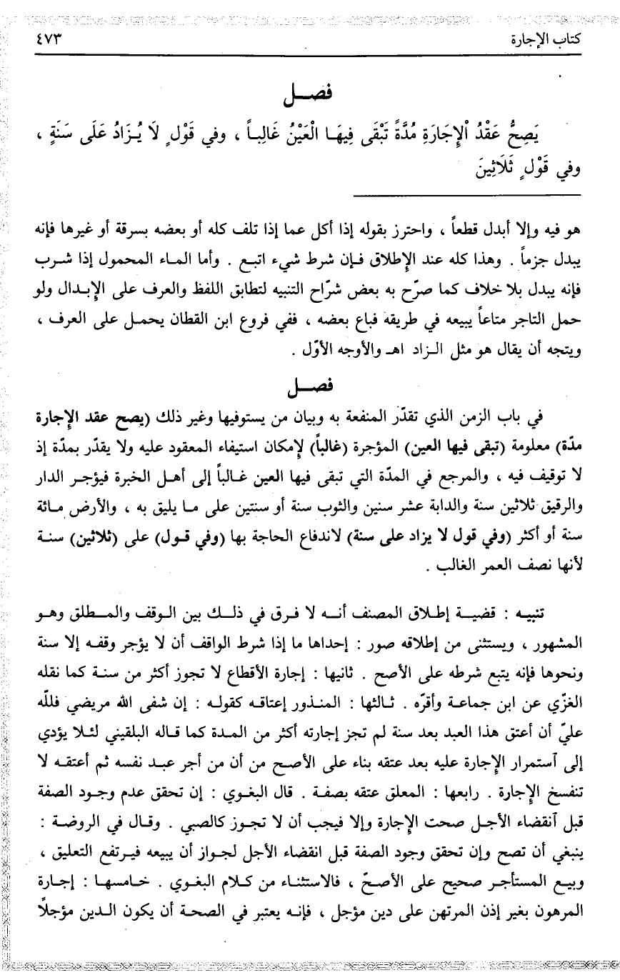 فَصْلٌ يَصِحُّ عَقْدُ الْإِجَارَةِ مُدَّةً تَبْقَى فِيهَا الْعَيْنُ غَالِبًا، وَفِي قَوْلٍ لَا يُزَادُ عَلَى سَنَةٍ وَفِي قَوْلٍ ثَلَاثِينَ