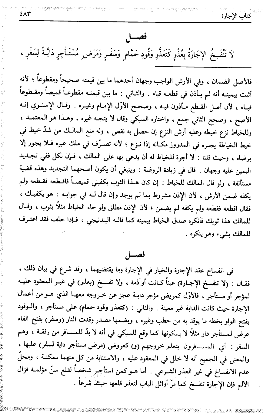 فَصْلٌ لَا تَنْفَسِخُ الْإِجَارَةُ بِعُذْرٍ كَتَعَذُّرِ وَقُودِ حَمَّامٍ وَسَفَرٍ وَمَرَضِ مُسْتَأْجِرِ دَابَّةٍ لِسَفَرٍ،
