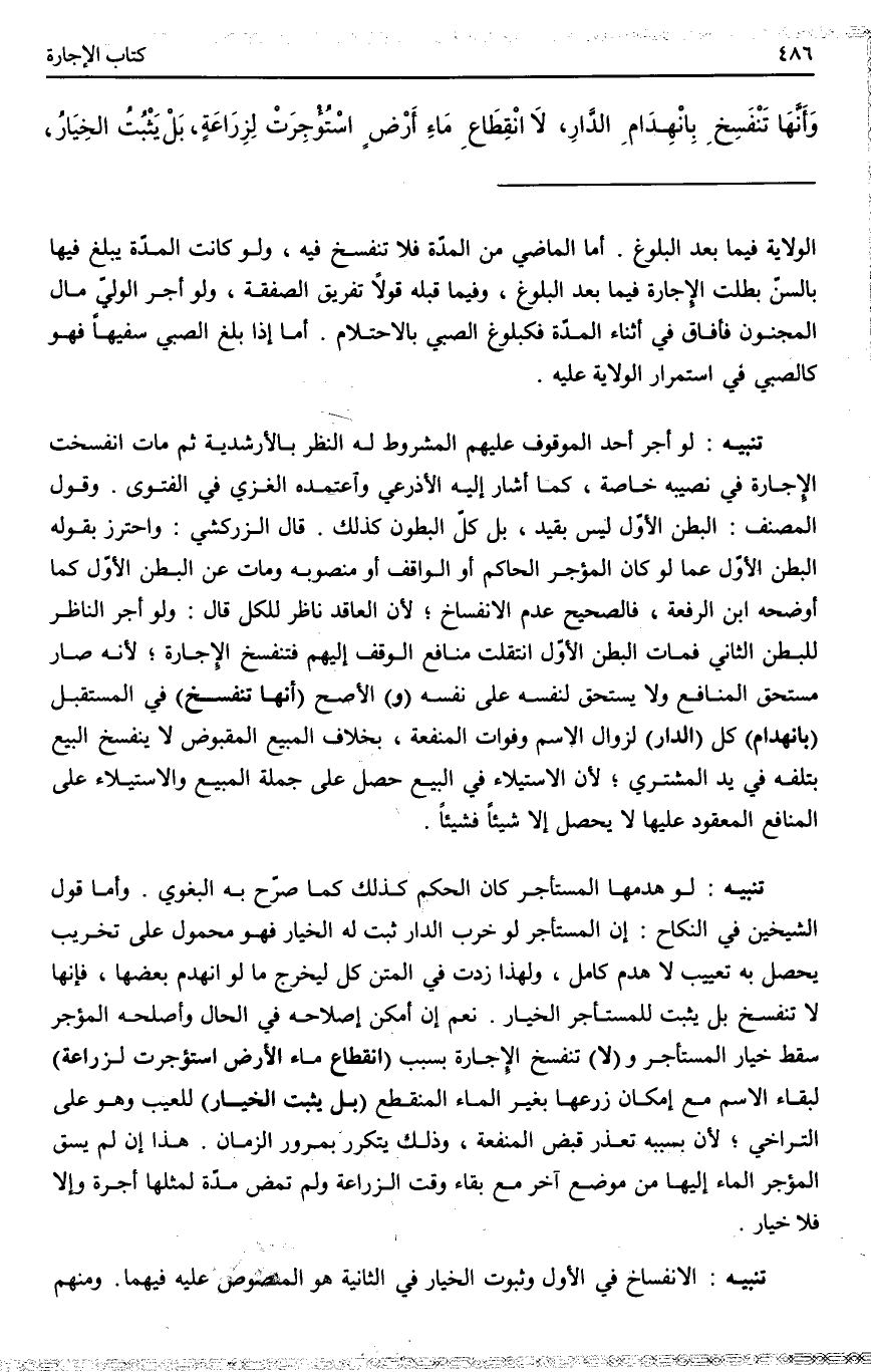 (وَلَا) تَنْفَسِخُ الْإِجَارَةُ بِسَبَبِ (انْقِطَاعِ مَاءِ أَرْضٍ اُسْتُؤْجِرَتْ لِزِرَاعَةٍ) لِبَقَاءِ الِاسْمِ مَعَ إمْكَانِ زَرْعِهَا بِغَيْرِ الْمَاءِ الْمُنْقَطِعِ، (بَلْ يَثْبُتُ الْخِيَارُ) لِلْعَيْبِ وَهُوَ عَلَى التَّرَاخِي؛ لِأَنَّ بِسَبَبِهِ تَعَذَّرَ قَبْضُ الْمَنْفَعَةِ، وَذَلِكَ يَتَكَرَّرُ بِمُرُورِ الزَّمَانِ. هَذَا إنْ لَمْ يَسُقْ الْمُؤَجِّرُ الْمَاءَ إلَيْهَا مِنْ مَوْضِعٍ آخَرَ، مَعَ بَقَاءِ وَقْتِ الزِّرَاعَةِ، وَلَمْ تَمْضِ مُدَّةٌ لِمِثْلِهَا أُجْرَةٌ، وَإِلَّا فَلَا خِيَارَ.