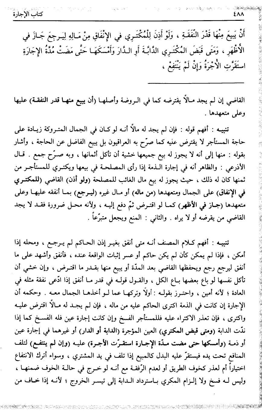 تَنْبِيهٌ أَفْهَمَ كَلَامُ الْمُصَنِّفِ أَنَّهُ مَتَى أَنْفَقَ بِغَيْرِ إذْنِ الْحَاكِمِ لَمْ يَرْجِعْ، وَمَحَلُّهُ إذَا أَمْكَنَ، فَإِذَا لَمْ يُمْكِنْ كَأَنْ لَمْ يَكُنْ حَاكِمٌ أَوْ عَسِرَ إثْبَاتُ الْوَاقِعَةِ عِنْدَهُ، فَأَنْفَقَ وَأَشْهَدَ عَلَى مَا أَنْفَقَ لِيَرْجِعَ رَجَعَ وَيَحْفَظُهَا الْقَاضِي بَعْدَ الْمُدَّةِ أَوْ يَبِيعَ مِنْهَا بِقَدْرِ مَا اقْتَرَضَ، وَإِنْ خَشِيَ أَنْ تَأْكُلَ نَفْسَهَا لَوْ بَاعَ بَعْضَهَا بَاعَ الْكُلَّ، وَالْقَوْلُ قَوْلُهُ فِي قَدْرِ مَا أَنْفَقَ إذَا ادَّعَى نَفَقَةَ مِثْلِهِ فِي الْعَادَةِ؛ لِأَنَّهُ أَمِينٌ، وَاحْتُرِزَ بِقَوْلِهِ: أَوَّلًا وَتَرَكَهَا عَمَّا لَوْ أَخَذَهَا الْجَمَّالُ مَعَهُ. وَحُكْمُهُ أَنَّ الْإِجَارَةَ إنْ كَانَتْ فِي الذِّمَّةِ اكْتَرَى الْحَاكِمُ عَلَيْهِ مِنْ مَالِهِ، فَإِنْ لَمْ يَجِدْ لَهُ مَالًا اقْتَرَضَ عَلَيْهِ وَاكْتَرَى، فَإِنْ تَعَذَّرَ الِاكْتِرَاءُ عَلَيْهِ فَلِلْمُسْتَأْجِرِ الْفَسْخُ، وَإِنْ كَانَتْ إجَارَةَ عَيْنٍ فَلَهُ الْفَسْخُ كَمَا إذَا نَدَّتْ الدَّابَّةُ.