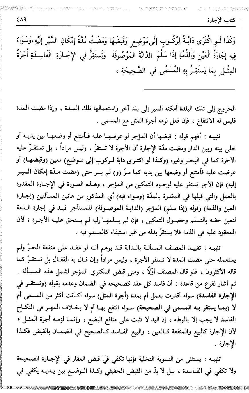 تَنْبِيهٌ أَفْهَمَ قَوْلُهُ: قَبَضَهَا أَنَّ الْمُؤَجِّرَ لَوْ عَرَضَهَا عَلَيْهِ فَامْتَنَعَ أَوْ وَضَعَهَا بَيْنَ يَدَيْهِ أَوْ خَلَّى بَيْنَهُ وَبَيْنَ الدَّارِ وَمَضَتْ مُدَّةِ الْإِجَارَةُ أَنَّ الْأُجْرَةَ لَا تَسْتَقِرُّ، وَلَيْسَ مُرَادًا، بَلْ تَسْتَقِرُّ عَلَيْهِ الْأُجْرَةُ كَمَا فِي الْبَحْرِ وَغَيْرِهِ، (وَكَذَا لَوْ اكْتَرَى دَابَّةً لِرُكُوبٍ إلَى مَوْضِعٍ) مُعَيَّنٍ (وَقَبَضَهَا) ، أَوْ عُرِضَتْ عَلَيْهِ فَامْتَنَعَ أَوْ وَضَعَهَا بَيْنَ يَدَيْهِ كَمَا مَرَّ (وَ) لَمْ يَسِرْ حَتَّى (مَضَتْ مُدَّةُ إمْكَانِ السَّيْرِ إلَيْهِ) فَإِنَّ الْأُجْرَةَ تَسْتَقِرُّ عَلَيْهِ لِوُجُودِ التَّمْكِينِ مِنْ الْمُؤَجِّرِ، وَهَذِهِ الصُّورَةُ فِي الْإِجَارَةِ الْمُقَدَّرَةِ بِالْعَمَلِ وَاَلَّتِي قَبْلَهَا فِي الْمُقَدَّرَةِ بِالْمُدَّةِ، (وَسَوَاءٌ فِيهِ) أَيْ الْمَذْكُورِ مِنْ هَاتَيْنِ الْمَسْأَلَتَيْنِ (إجَارَةُ الْعَيْنِ وَالذِّمَّةِ) ، وَقَوْلُهُ: (إذَا سَلَّمَ) الْمُؤَجِّرُ (الدَّابَّةَ الْمَوْصُوفَةَ) لِلْمُسْتَأْجِرِ قَيْدٌ فِي إجَارَةِ الذِّمَّةِ لِتَعَيُّنِ حَقِّهِ بِالتَّسَلُّمِ وَحُصُولِ التَّمْكِينِ، فَإِنْ لَمْ يُسَلِّمْهَا إلَيْهِ لَمْ يَسْتَحِقَّ عَلَيْهِ الْأُجْرَةَ؛ لِأَنَّ الْمَعْقُودَ عَلَيْهِ فِي الذِّمَّةِ فَلَا يَسْتَقِرُّ بَدَلُهُ مِنْ غَيْرِ اسْتِيفَاءٍ كَالْمُسْلَمِ فِيهِ.