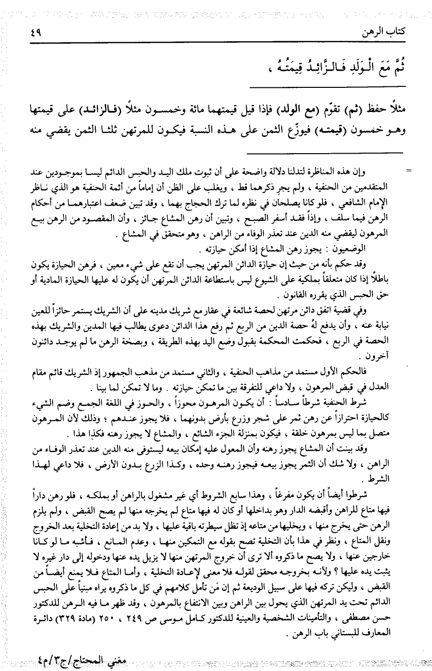 ـــــــــــــــــــــــــــــQمَثَلًا حُفِظَ (ثُمَّ) تُقَوَّمُ (مَعَ الْوَلَدِ) فَإِذَا قِيلَ قِيمَتُهُمَا مِائَةٌ وَخَمْسُونَ مَثَلًا (فَالزَّائِدُ) عَلَى قِيمَتِهَا وَهُوَ خَمْسُونَ (قِيمَتُهُ) فَيُوَزَّعُ الثَّمَنُ عَلَى هَذِهِ النِّسْبَةِ فَيَكُونُ لِلْمُرْتَهِنِ ثُلُثَا الثَّمَنِ يَقْضِي مِنْهُ