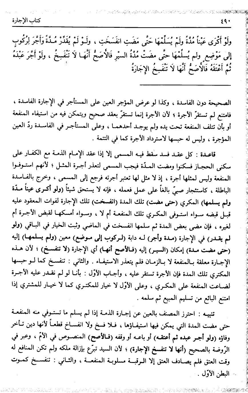 ـــــــــــــــــــــــــــــQالصَّحِيحَةِ دُونَ الْفَاسِدَةِ، وَكَذَا لَوْ عَرَضَ الْمُؤَجِّرُ الْعَيْنَ عَلَى الْمُسْتَأْجِرِ فِي الْإِجَارَةِ الْفَاسِدَةِ، فَامْتَنَعَ لَمْ تَسْتَقِرَّ الْأُجْرَةُ؛ لِأَنَّ الْأُجْرَةَ إنَّمَا تَسْتَقِرُّ بِعَقْدٍ صَحِيحٍ، وَيُتَمَكَّنُ فِيهِ مِنْ اسْتِيفَاءِ الْمَنْفَعَةِ، أَوْ بِأَنْ تَتْلَفَ الْمَنْفَعَةُ تَحْتَ يَدِهِ، وَلَمْ يُوجَدْ أَحَدُهُمَا. وَعَلَى الْمُسْتَأْجِرِ فِي الْفَاسِدَةِ رَدُّ الْعَيْنِ الْمُؤَجَّرَةِ، وَلَيْسَ لَهُ حَبْسُهَا لِاسْتِرْدَادِ الْأُجْرَةِ كَمَا فِي التَّتِمَّةِ قَاعِدَةٌ كُلُّ عَقْدٍ فَسَدَ سَقَطَ فِيهِ الْمُسَمَّى إلَّا إذَا عَقَدَ الْإِمَامُ الذِّمَّةَ مَعَ الْكُفَّارِ عَلَى سُكْنَى الْحِجَازِ فَسَكَنُوا وَمَضَتْ الْمُدَّةُ فَيَجِبُ الْمُسَمَّى لِتَعَذُّرِ أُجْرَةِ الْمِثْلِ؛ لِأَنَّهُمْ اسْتَوْفَوْا الْمَنْفَعَةَ وَلَيْسَ لِمِثْلِهَا أُجْرَةٌ، إذْ لَا مِثْلَ لَهَا تُعْتَبَرُ أُجْرَتُهُ فَرَجَعَ إلَى الْمُسَمَّى، وَخَرَجَ بِالْفَاسِدَةِ الْبَاطِلَةُ، كَاسْتِئْجَارِ صَبِيٍّ بَالِغًا عَلَى عَمَلٍ فَعَمِلَهُ، فَإِنَّهُ لَا يَسْتَحِقُّ شَيْئًا.