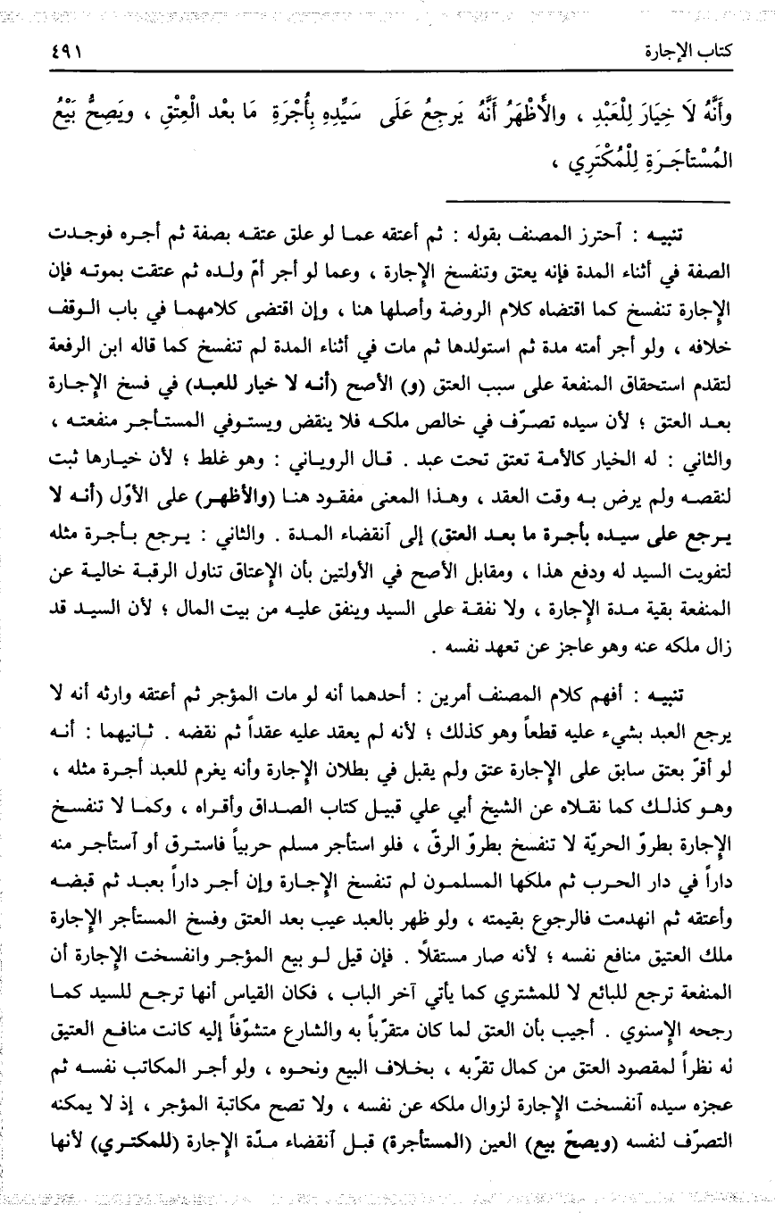 وَكَمَا لَا تَنْفَسِخُ الْإِجَارَةُ بِطُرُوِّ الْحُرِّيَّةِ لَا تَنْفَسِخُ بِطُرُوِّ الرِّقِّ، فَلَوْ اسْتَأْجَرَ مُسْلِمٌ حَرْبِيًّا فَاسْتُرِقَّ، أَوْ اسْتَأْجَرَ مِنْهُ دَارًا فِي دَارِ الْحَرْبِ ثُمَّ مَلَكَهَا الْمُسْلِمُونَ - لَمْ تَنْفَسِخْ الْإِجَارَةُ، وَإِنْ أَجَّرَ دَارًا بِعَبْدٍ ثُمَّ قَبَضَهُ وَأَعْتَقَهُ، ثُمَّ انْهَدَمَتْ - فَالرُّجُوعُ بِقِيمَتِهِ، وَلَوْ ظَهَرَ بِالْعَبْدِ عَيْبٌ بَعْدَ الْعِتْقِ وَفَسَخَ الْمُسْتَأْجِرُ الْإِجَارَةَ مَلَكَ الْعَتِيقُ مَنَافِعَ نَفْسِهِ؛ لِأَنَّهُ صَارَ مُسْتَقِلًّا. فَإِنْ قِيلَ لَوْ بِيعَ الْمُؤَجَّرُ وَانْفَسَخَتْ الْإِجَارَةُ إنَّ الْمَنْفَعَةَ تَرْجِعُ لِلْبَائِعِ لَا لِلْمُشْتَرِي كَمَا يَأْتِي آخِرَ الْبَابِ، فَكَانَ الْقِيَاسُ أَنَّهَا تَرْجِعُ لِلسَّيِّدِ كَمَا رَجَّحَهُ الْإِسْنَوِيُّ.
