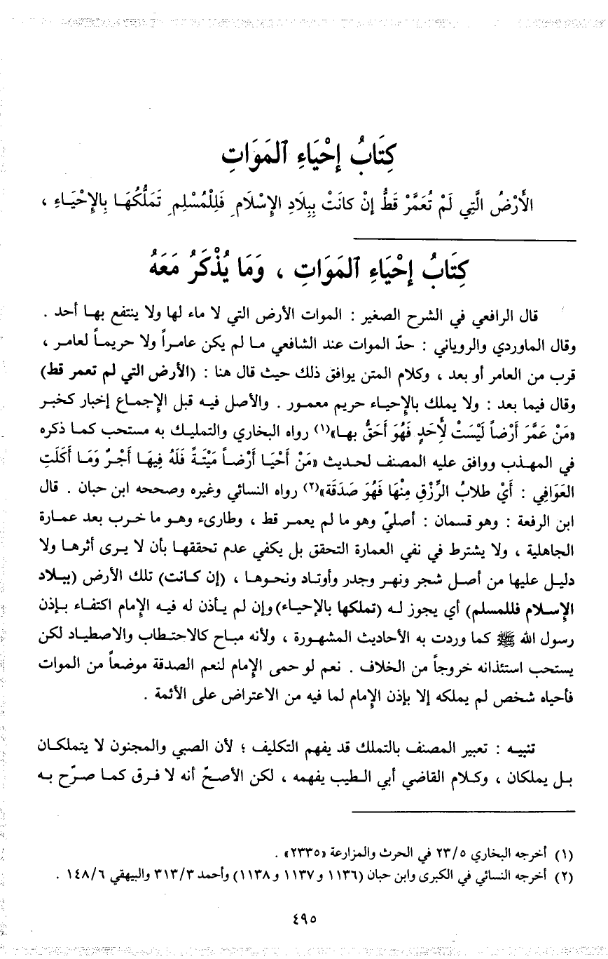 كِتَابُ إحْيَاءِ الْمَوَاتِ الْأَرْضُ الَّتِي لَمْ تُعَمَّرْ قَطُّ إنْ كَانَتْ بِبِلَادِ الْإِسْلَامِ؛ فَلِلْمُسْلِمِ تَمَلُّكُهَا بِالْإِحْيَاءِ.