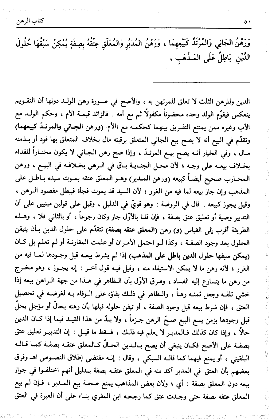 (وَرَهْنُ الْمُدَبَّرِ) وَهُوَ الْمُعَلَّقُ عِتْقُهُ بِمَوْتِ سَيِّدِهِ بَاطِلٌ عَلَى الْمَذْهَبِ وَإِنْ جَازَ بَيْعُهُ لِمَا فِيهِ مِنْ الْغَرَرِ؛ لِأَنَّ السَّيِّدَ قَدْ يَمُوتُ فَجْأَةً فَيَبْطُلُ مَقْصُودُ الرَّهْنِ، وَقِيلَ يَجُوزُ كَبَيْعِهِ. قَالَ فِي الرَّوْضَةِ: وَهُوَ قَوِيٌّ فِي الدَّلِيلِ، وَقِيلَ عَلَى قَوْلَيْنِ مَبْنِيَّيْنِ عَلَى أَنَّ التَّدْبِيرَ وَصِيَّةٌ أَوْ تَعْلِيقُ عِتْقٍ بِصِفَةٍ، فَإِنْ قُلْنَا بِالْأَوَّلِ جَازَ وَكَانَ رُجُوعًا أَوْ بِالثَّانِي فَلَا، وَهَذِهِ الطَّرِيقَةُ أَقْرَبُ إلَى الْقِيَاسِ.