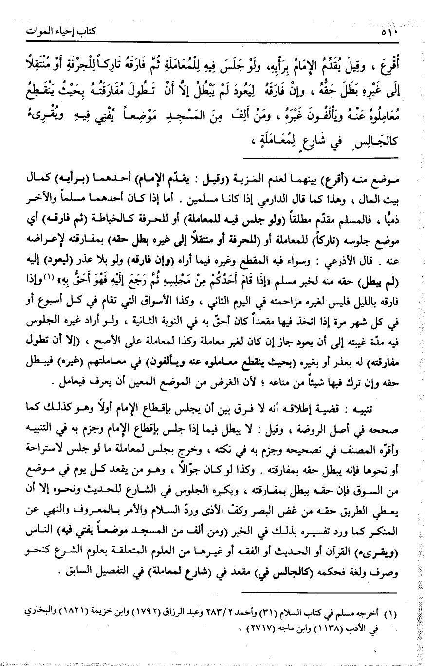(وَلَوْ جَلَسَ فِيهِ لِلْمُعَامَلَةِ) أَوْ لِلْحِرْفَةِ كَالْخِيَاطَةِ (ثُمَّ فَارَقَهُ) أَيْ مَوْضِعَ جُلُوسِهِ (تَارِكًا) لِلْمُعَامَلَةِ أَوْ (لِلْحِرْفَةِ أَوْ مُنْتَقِلًا إلَى غَيْرِهِ؛ بَطَلَ حَقُّهُ) بِمُفَارَقَتِهِ؛ لِإِعْرَاضِهِ عَنْهُ. قَالَ الْأَذْرَعِيُّ: وَسَوَاءٌ فِيهِ الْمُقْطَعُ وَغَيْرُهُ فِيمَا أَرَاهُ (وَإِنْ فَارَقَهُ) وَلَوْ بِلَا عُذْرٍ (لِيَعُودَ) إلَيْهِ (لَمْ يَبْطُلْ) حَقُّهُ مِنْهُ لِخَبَرِ مُسْلِمٍ «إذَا قَامَ أَحَدُكُمْ مِنْ مَجْلِسِهِ ثُمَّ رَجَعَ إلَيْهِ فَهُوَ أَحَقُّ بِهِ» وَإِذَا فَارَقَهُ بِاللَّيْلِ فَلَيْسَ لِغَيْرِهِ مُزَاحَمَتُهُ فِي الْيَوْمِ الثَّانِي، وَكَذَا الْأَسْوَاقُ الَّتِي تُقَامُ فِي كُلِّ أُسْبُوعٍ أَوْ فِي كُلِّ شَهْرٍ مَرَّةً إذَا اتَّخَذَ فِيهَا مَقْعَدًا كَانَ أَحَقَّ بِهِ فِي النَّوْبَةِ الثَّانِيَةِ، وَلَوْ أَرَادَ غَيْرُهُ الْجُلُوسَ فِيهِ مُدَّةَ غَيْبَتِهِ إلَى أَنْ يَعُودَ؛ جَازَ إنْ كَانَ لِغَيْرِ مُعَامَلَةٍ وَكَذَا لِمُعَامَلَةٍ عَلَى الْأَصَحِّ، (إلَّا أَنْ تَطُولَ مُفَارَقَتُهُ) لَهُ بِعُذْرٍ أَوْ بِغَيْرِهِ (بِحَيْثُ يَنْقَطِعُ مُعَامِلُوهُ عَنْهُ وَيَأْلَفُونَ) فِي مُعَامَلَتِهِمْ (غَيْرَهُ) فَيَبْطُلُ حَقُّهُ وَإِنْ تَرَكَ فِيهَا شَيْئًا مِنْ مَتَاعِهِ؛ لِأَنَّ الْغَرَضَ مِنْ الْمَوْضِعِ الْمُعَيَّنِ أَنْ يُعْرَفَ فَيُعَامَلَ.