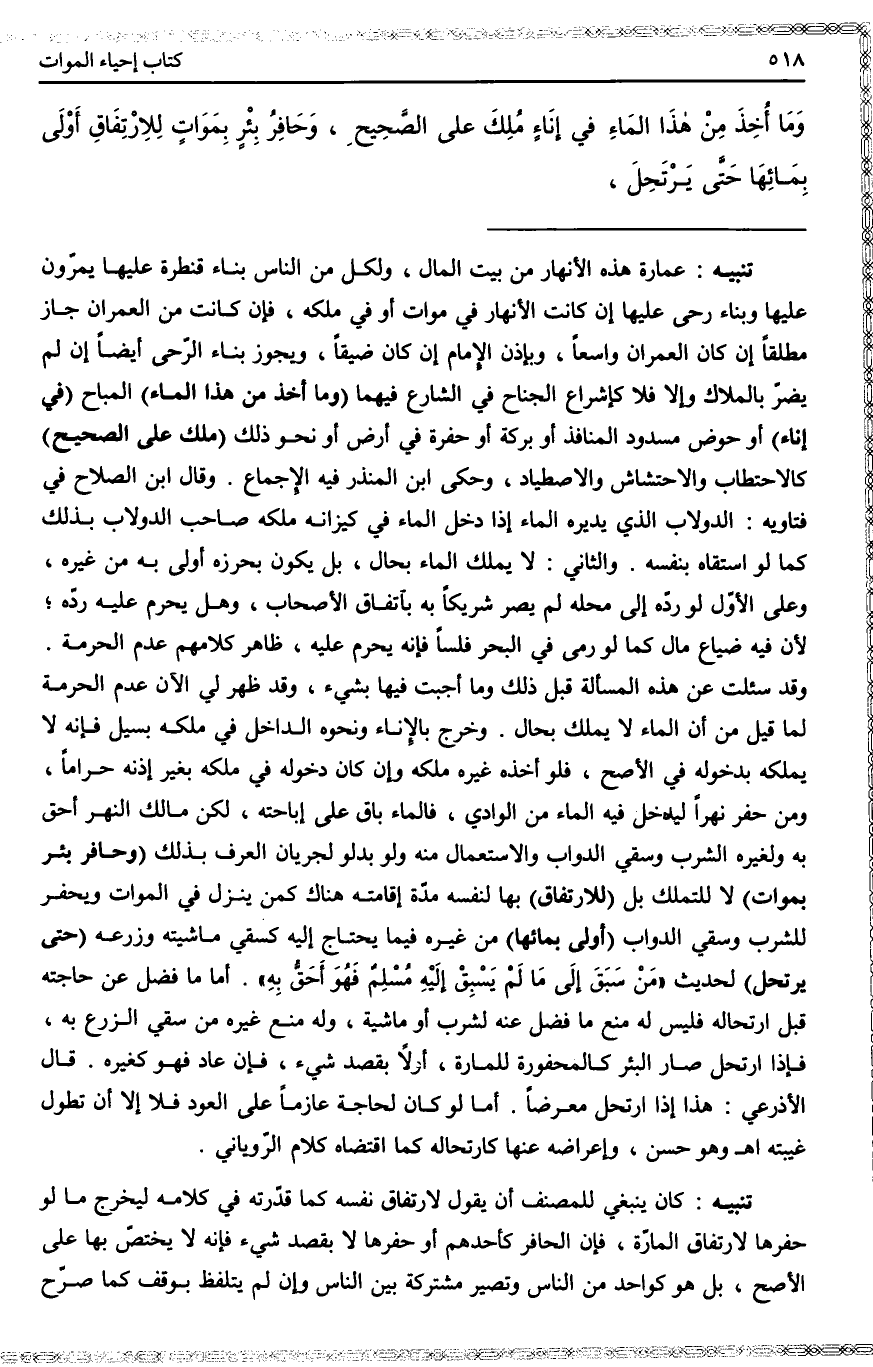 (وَحَافِرُ بِئْرٍ بِمَوَاتٍ) لَا لِلتَّمَلُّكِ بَلْ (لِلِارْتِفَاقِ) بِهَا لِنَفْسِهِ مُدَّةَ إقَامَتِهِ هُنَاكَ كَمَنْ يَنْزِلُ فِي الْمَوَاتِ وَيَحْفِرُ لِلشُّرْبِ وَسَقْيِ الدَّوَابِّ (أَوْلَى بِمَائِهَا) مِنْ غَيْرِهِ فِيمَا يَحْتَاجُ إلَيْهِ كَسَقْيِ مَاشِيَتِهِ وَزَرْعِهِ (حَتَّى يَرْتَحِلَ) لِحَدِيثِ «مَنْ سَبَقَ إلَى مَا لَمْ يَسْبِقْ إلَيْهِ مُسْلِمٌ فَهُوَ أَحَقُّ بِهِ» أَمَّا مَا فَضَلَ عَنْ حَاجَتِهِ قَبْلَ ارْتِحَالِهِ فَلَيْسَ لَهُ مَنْعُ مَا فَضَلَ عَنْهُ لِشُرْبٍ أَوْ مَاشِيَةٍ، وَلَهُ مَنْعُ غَيْرِهِ مِنْ سَقْيِ الزَّرْعِ بِهِ، فَإِذَا ارْتَحَلَ صَارَ الْبِئْرُ كَالْمَحْفُورَةِ لِلْمَارَّةِ، أَوَّلًا بِقَصْدِ شَيْءٍ، فَإِنْ عَادَ فَهُوَ كَغَيْرِهِ. قَالَ الْأَذْرَعِيُّ: هَذَا إذَا ارْتَحَلَ مُعْرِضًا. أَمَّا لَوْ كَانَ لِحَاجَةٍ عَازِمًا عَلَى الْعَوْدِ فَلَا إلَّا أَنْ تَطُولَ غَيْبَتُهُ اهـ.