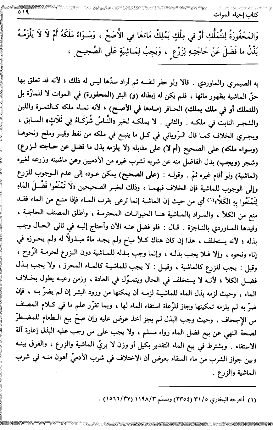 (وَ) الْبِئْرُ (الْمَحْفُورَةُ) فِي الْمَوَاتِ لَا لِلْمَارَّةِ بَلْ (لِلتَّمَلُّكِ أَوْ فِي مِلْكٍ يَمْلِكُ) الْحَافِرُ (مَاءَهَا فِي الْأَصَحِّ) ؛ لِأَنَّهُ نَمَاءُ مِلْكِهِ كَالثَّمَرَةِ وَاللَّبَنِ وَالشَّجَرِ النَّابِتِ فِي مِلْكِهِ. وَالثَّانِي: لَا يَمْلِكُهُ لِخَبَرِ «النَّاسُ شُرَكَاءُ فِي ثَلَاثٍ» السَّابِقِ، وَيَجْرِي الْخِلَافُ كَمَا قَالَ الرُّويَانِيُّ فِي كُلِّ مَا يَنْبُعُ فِي مِلْكِهِ مِنْ نِفْطٍ وَقِيرٍ وَمِلْحٍ وَنَحْوِهَا (وَسَوَاءٌ مَلَكَهُ) عَلَى الصَّحِيحِ (أَمْ لَا) عَلَى مُقَابِلِهِ (لَا يَلْزَمُهُ بَذْلُ مَا فَضَلَ عَنْ حَاجَتِهِ لِزَرْعٍ) وَشَجَرٍ (وَيَجِبُ) بَذْلُ الْفَاضِلِ مِنْهُ عَنْ شُرْبِهِ لِشُرْبِ غَيْرِهِ مِنْ الْآدَمِيِّينَ وَعَنْ مَاشِيَتِهِ وَزَرْعِهِ لِغَيْرِهِ (لِمَاشِيَةٍ) وَلَوْ أَقَامَ غَيْرُهُ ثَمَّ. وَقَوْلُهُ: (عَلَى الصَّحِيحِ) يُمْكِنُ عَوْدُهُ إلَى عَدَمِ الْوُجُوبِ لِلزَّرْعِ وَإِلَى الْوُجُوبِ لِلْمَاشِيَةِ فَإِنَّ الْخِلَافَ فِيهِمَا، وَذَلِكَ لِخَبَرِ الصَّحِيحَيْنِ «لَا تَمْنَعُوا فَضْلَ الْمَاءِ لِتَمْنَعُوا بِهِ الْكَلَأَ» أَيْ مِنْ حَيْثُ إنَّ الْمَاشِيَةَ إنَّمَا تَرْعَى بِقُرْبِ الْمَاءِ فَإِذَا مَنَعَ مِنْ الْمَاءِ فَقَدْ مَنَعَ مِنْ الْكَلَأِ، وَالْمُرَادُ بِالْمَاشِيَةِ هُنَا الْحَيَوَانَاتُ الْمُحْتَرَمَةُ، وَأَطْلَقَ الْمُصَنِّفُ الْحَاجَةَ، وَقَيَّدَهَا الْمَاوَرْدِيُّ بِالنَّاجِزَةِ. قَالَ: فَلَوْ فَضَلَ عَنْهُ الْآنَ وَاحْتَاجَ إلَيْهِ فِي ثَانِي الْحَالِ وَجَبَ بَذْلُهُ؛ لِأَنَّهُ يُسْتَخْلَفُ، هَذَا إنْ كَانَ هُنَاكَ كَلَأٌ مُبَاحٌ وَلَمْ يَجِدْ مَاءً مَبْذُولًا لَهُ وَلَمْ يُحْرِزْهُ فِي إنَاءٍ وَنَحْوِهِ، وَإِلَّا فَلَا يَجِبُ بَذْلُهُ، وَإِنَّمَا وَجَبَ بَذْلُهُ لِلْمَاشِيَةِ دُونَ الزَّرْعِ لِحُرْمَةِ الرُّوحِ، وَقِيلَ: يَجِبُ لِلزَّرْعِ كَالْمَاشِيَةِ، وَقِيلَ: لَا يَجِبُ لِلْمَاشِيَةِ كَالْمَاءِ الْمُحْرَزِ، وَلَا يَجِبُ بَذْلُ فَضْلِ الْكَلَأِ؛ لِأَنَّهُ لَا يُسْتَخْلَفُ فِي الْحَالِ وَيُتَمَوَّلُ فِي الْعَادَةِ، وَزَمَنُ رَعْيِهِ يَطُولُ بِخِلَافِ الْمَاءِ، وَحَيْثُ لَزِمَهُ بَذْلُ الْمَاءِ لِلْمَاشِيَةِ لَزِمَهُ أَنْ يُمَكِّنَهَا مِنْ وُرُودِ الْبِئْرِ إنْ لَمْ يَضُرَّ بِهِ، فَإِنْ ضَرَّ بِهِ لَمْ يَلْزَمْهُ تَمْكِينُهَا وَجَازَ لِلرُّعَاةِ اسْتِقَاءُ الْمَاءِ لَهَا، وَبِمَا تَقَرَّرَ عُلِمَ مَا فِي كَلَامِ الْمُصَنِّفِ مِنْ الْإِجْحَافِ، وَحَيْثُ وَجَبَ الْبَذْلُ لَمْ يَجُزْ أَخْذُ عِوَضٍ عَلَيْهِ وَإِنْ صَحَّ بَيْعُ الطَّعَامِ لِلْمُضْطَرِّ لِصِحَّةِ النَّهْيِ عَنْ بَيْعِ فَضْلِ الْمَاءِ رَوَاهُ مُسْلِمٌ، وَلَا يَجِبُ عَلَى مَنْ وَجَبَ عَلَيْهِ الْبَذْلُ إعَارَةُ آلَةِ الِاسْتِقَاءِ. وَيُشْتَرَطُ فِي بَيْعِ الْمَاءِ التَّقْدِيرُ بِكَيْلٍ أَوْ وَزْنٍ لَا بِرَيِّ الْمَاشِيَةِ وَالزَّرْعِ، وَالْفَرْقُ بَيْنَهُ وَبَيْنَ جَوَازِ الشُّرْبِ مِنْ مَاءِ السِّقَاءِ بِعِوَضٍ أَنَّ الِاخْتِلَافَ فِي شُرْبِ الْآدَمِيِّ أَهْوَنُ مِنْهُ فِي شُرْبِ الْمَاشِيَةِ وَالزَّرْعِ.