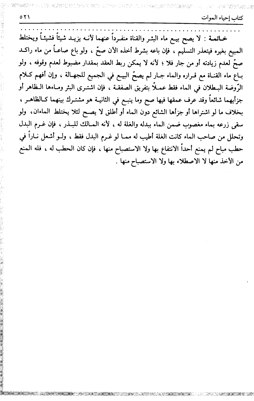 ـــــــــــــــــــــــــــــQخَاتِمَةٌ لَا يَصِحُّ بَيْعُ مَاءِ الْبِئْرِ وَالْقَنَاةِ مُنْفَرِدًا عَنْهُمَا لِأَنَّهُ يَزِيدُ شَيْئًا فَشَيْئًا وَيَخْتَلِطُ الْمَبِيعُ بِغَيْرِهِ فَيَتَعَذَّرُ التَّسْلِيمُ، فَإِنْ بَاعَهُ بِشَرْطِ أَخْذِهِ الْآنَ صَحَّ، وَلَوْ بَاعَ صَاعًا مِنْ مَاءٍ رَاكِدٍ صَحَّ لِعَدَمِ زِيَادَتِهِ أَوْ مِنْ جَارٍ فَلَا؛ لِأَنَّهُ لَا يُمْكِنُ رَبْطُ الْعَقْدِ بِمِقْدَارٍ مَضْبُوطٍ لِعَدَمِ وُقُوفِهِ، وَلَوْ بَاعَ مَاءَ الْقَنَاةِ مَعَ قَرَارِهِ وَالْمَاءُ جَارٍ لَمْ يَصِحَّ الْبَيْعُ فِي الْجَمِيعِ لِلْجَهَالَةِ، وَإِنْ أَفْهَمَ كَلَامُ الرَّوْضَةِ الْبُطْلَانَ فِي الْمَاءِ فَقَطْ عَمَلًا بِتَفْرِيقِ الصَّفْقَةِ، فَإِنْ اشْتَرَى الْبِئْرَ وَمَاءَهَا الظَّاهِرَ أَوْ جُزْأَيْهِمَا شَائِعًا وَقَدْ عُرِفَ عُمْقُهَا فِيهَا صَحَّ وَمَا يَنْبُعُ فِي الثَّانِيَةِ هُوَ مُشْتَرَكٌ بَيْنَهُمَا كَالظَّاهِرِ، بِخِلَافِ مَا لَوْ اشْتَرَاهَا أَوْ جُزْأَهَا الشَّائِعَ دُونَ الْمَاءِ أَوْ أُطْلِقَ؛ لَا يَصِحُّ لِئَلَّا يَخْتَلِطَ الْمَاءَانِ.
