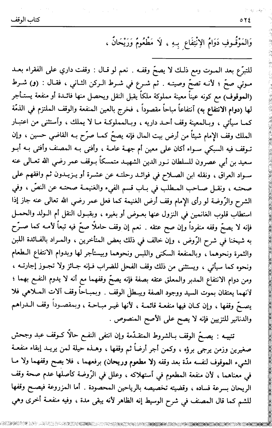 (لَا مَطْعُومٌ وَرَيْحَانٌ) بِرَفْعِهِمَا، فَلَا يَصِحُّ وَقْفُهُمَا وَلَا مَا فِي مَعْنَاهُمَا، لِأَنَّ مَنْفَعَةَ الْمَطْعُومِ فِي اسْتِهْلَاكِهِ، وَعَلَّلَ فِي الرَّوْضَةِ كَأَصْلِهَا عَدَمُ صِحَّةِ وَقْفِ الرَّيْحَانِ بِسُرْعَةِ فَسَادِهِ، وَقَضِيَّتُهُ تَخْصِيصُهُ بِالرَّيَاحِينِ الْمَحْصُودَةِ. أَمَّا الْمَزْرُوعَةُ فَيَصِحُّ وَقْفُهَا لِلشَّمِّ كَمَا قَالَ الْمُصَنِّفُ فِي شَرْحِ الْوَسِيطِ أَنَّهُ الظَّاهِرُ لِأَنَّهُ يَبْقَى مُدَّةً، وَفِيهِ مَنْفَعَةٌ أُخْرَى وَهِيَ