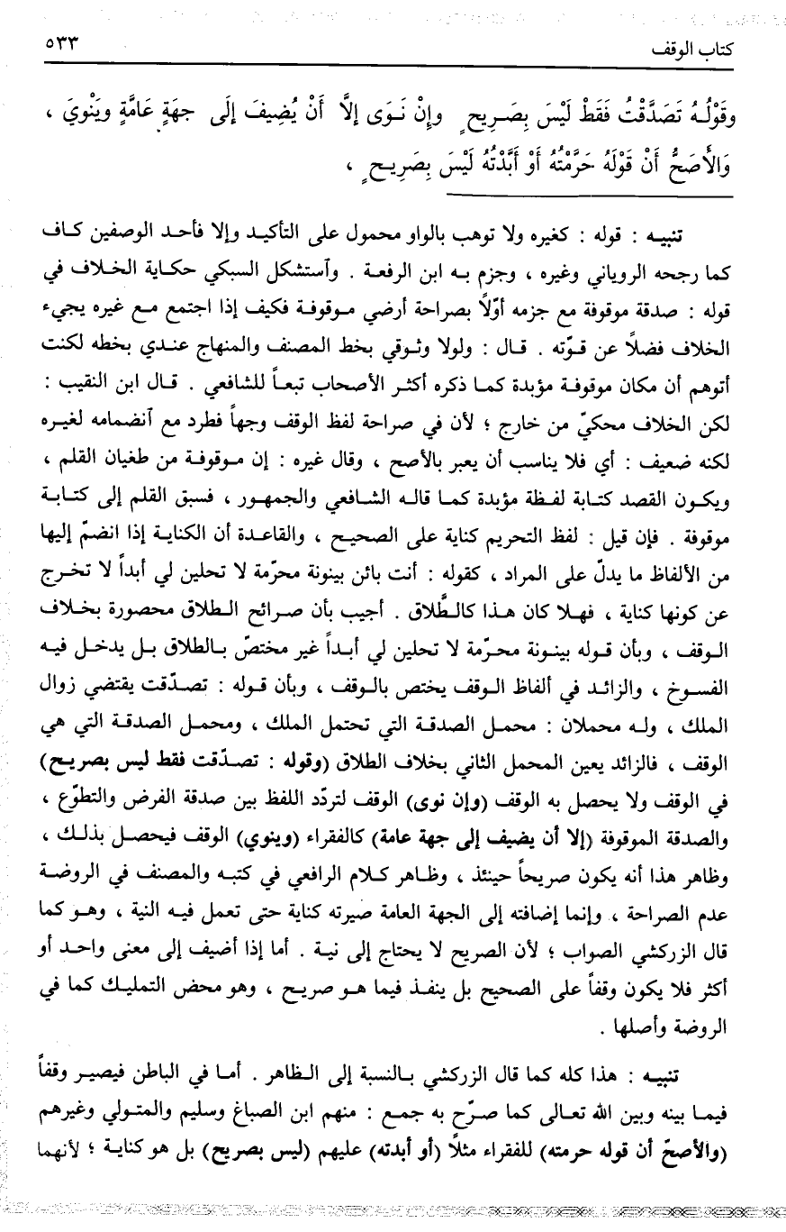 ـــــــــــــــــــــــــــــQتَنْبِيهٌ قَوْلُهُ: كَغَيْرِهِ وَلَا تُوهَبُ بِالْوَاوِ مَحْمُولٌ عَلَى التَّأْكِيدِ وَإِلَّا فَأَحَدُ الْوَصْفَيْنِ كَافٍ كَمَا رَجَّحَهُ الرُّويَانِيُّ وَغَيْرُهُ، وَجَزَمَ بِهِ ابْنُ الرِّفْعَةِ. وَاسْتَشْكَلَ السُّبْكِيُّ حِكَايَةَ الْخِلَافِ فِي قَوْلِهِ: صَدَقَةٌ مَوْقُوفَةٌ مَعَ جَزْمِهِ أَوَّلًا بِصَرَاحَةٍ أَرْضِي مَوْقُوفَةٌ فَكَيْفَ إذَا اجْتَمَعَ مَعَ غَيْرِهِ يَجِيءُ الْخِلَافُ فَضْلًا عَنْ قُوَّتِهِ. قَالَ: وَلَوْلَا وُثُوقِي بِخَطِّ الْمُصَنِّفِ وَالْمِنْهَاجُ عِنْدِي بِخَطِّهِ لَكُنْت أَتَوَهَّمُ أَنَّ مَكَانَ مَوْقُوفَةٌ مُؤَبَّدَةٌ كَمَا ذَكَرَهُ أَكْثَرُ الْأَصْحَابِ تَبَعًا لِلشَّافِعِيِّ قَالَ ابْنُ النَّقِيبِ: لَكِنَّ الْخِلَافَ مَحْكِيٌّ مِنْ خَارِجٍ؛ لِأَنَّ فِي صَرَاحَةِ لَفْظِ الْوَقْفِ وَجْهًا فَطُرِدَ مَعَ انْضِمَامِهِ لِغَيْرِهِ لَكِنَّهُ ضَعِيفٌ: أَيْ فَلَا يُنَاسِبُ أَنْ يُعَبِّرَ بِالْأَصَحِّ، وَقَالَ غَيْرُهُ: إنَّ مَوْقُوفَةٌ مِنْ طُغْيَانِ الْقَلَمِ، وَيَكُونُ الْقَصْدُ كِتَابَةَ لَفْظَةِ مُؤَبَّدَةٌ كَمَا قَالَهُ الشَّافِعِيُّ وَالْجُمْهُورُ، فَسَبَقَ الْقَلَمُ إلَى كِتَابَةِ مَوْقُوفَةٌ. فَإِنْ قِيلَ: لَفْظُ التَّحْرِيمِ كِنَايَةٌ عَلَى الصَّحِيحِ، وَالْقَاعِدَةُ أَنَّ الْكِنَايَةَ إذَا انْضَمَّ إلَيْهَا مِنْ الْأَلْفَاظِ مَا يَدُلُّ عَلَى الْمُرَادِ، كَقَوْلِهِ: أَنْتِ بَائِنٌ بَيْنُونَةً مُحَرَّمَةً لَا تَحِلِّينَ لِي أَبَدًا؛ لَا تَخْرُجُ عَنْ كَوْنِهَا كِنَايَةً، فَهَلَّا كَانَ هَذَا كَالطَّلَاقِ،.