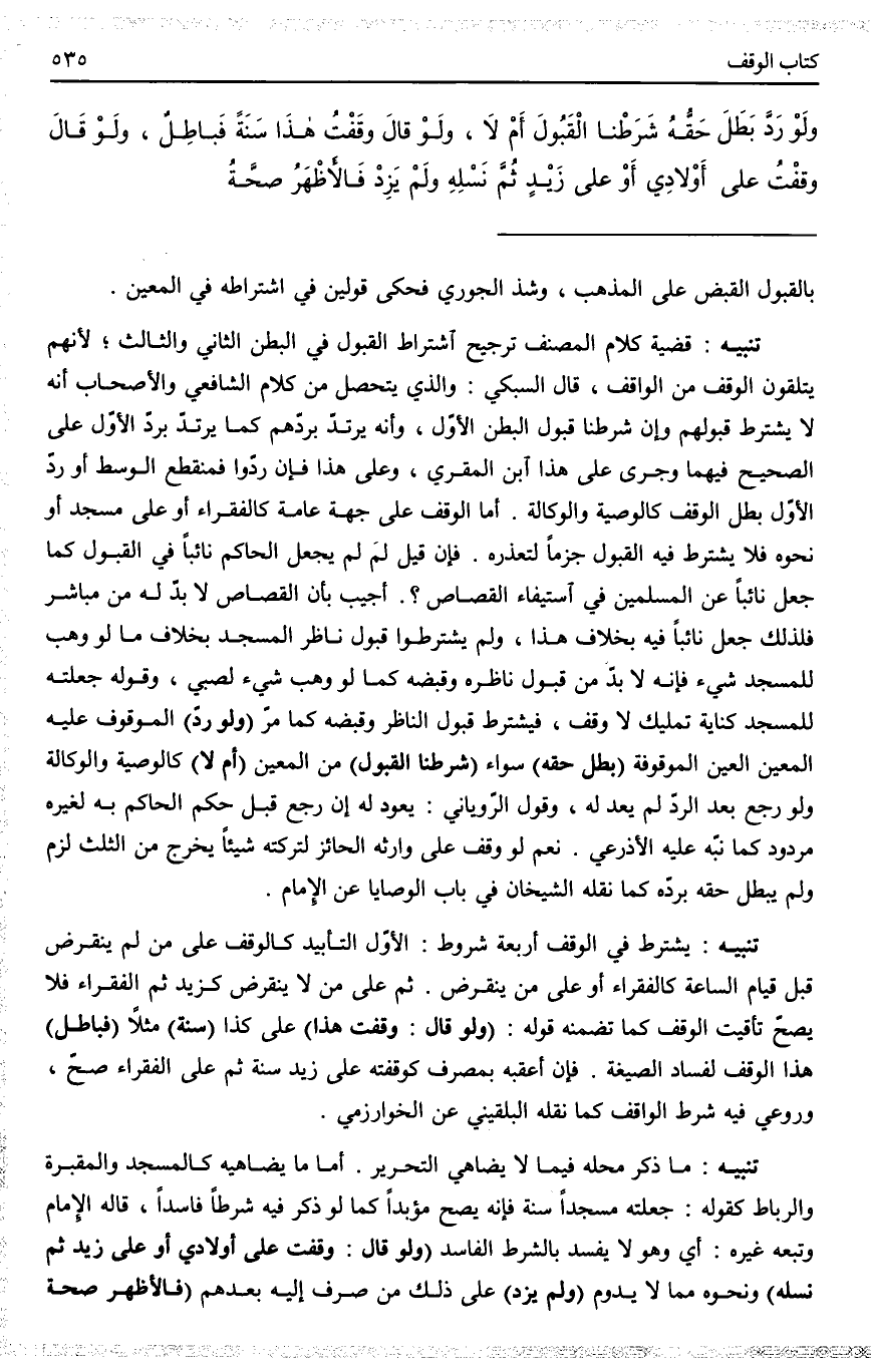 تَنْبِيهٌ قَضِيَّةُ كَلَامِ الْمُصَنِّفِ تَرْجِيحُ اشْتِرَاطِ الْقَبُولِ فِي الْبَطْنِ الثَّانِي وَالثَّالِثِ؛ لِأَنَّهُمْ يَتَلَقَّوْنَ الْوَقْفَ مِنْ الْوَاقِفِ، قَالَ السُّبْكِيُّ: وَاَلَّذِي يَتَحَصَّلُ مِنْ كَلَامِ الشَّافِعِيِّ وَالْأَصْحَابِ أَنَّهُ لَا يُشْتَرَطُ قَبُولُهُمْ وَإِنْ شَرَطْنَا قَبُولَ الْبَطْنِ الْأَوَّلِ، وَأَنَّهُ يَرْتَدُّ بِرَدِّهِمْ كَمَا يَرْتَدُّ بِرَدِّ الْأَوَّلِ عَلَى الصَّحِيحِ فِيهِمَا وَجَرَى عَلَى هَذَا ابْنُ الْمُقْرِي، وَعَلَى هَذَا فَإِنْ رَدُّوا فَمُنْقَطِعُ الْوَسَطِ أَوْ رُدَّ الْأَوَّلُ بَطَلَ الْوَقْفُ كَالْوَصِيَّةِ وَالْوَكَالَةِ. أَمَّا الْوَقْفُ عَلَى جِهَةٍ عَامَّةٍ كَالْفُقَرَاءِ أَوْ عَلَى مَسْجِدٍ أَوْ نَحْوِهِ فَلَا يُشْتَرَطُ فِيهِ الْقَبُولُ جَزْمًا لِتَعَذُّرِهِ. فَإِنْ قِيلَ لِمَ لَمْ يُجْعَل الْحَاكِمُ نَائِبًا فِي الْقَبُولِ كَمَا جُعِلَ نَائِبًا عَنْ الْمُسْلِمِينَ فِي اسْتِيفَاءِ الْقِصَاصِ؟ .