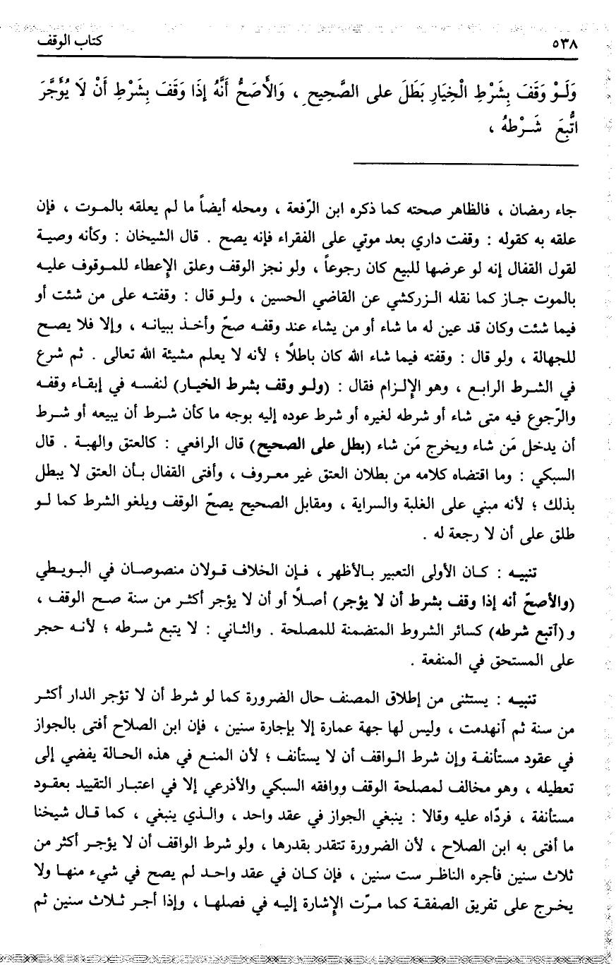 تَنْبِيهٌ يُسْتَثْنَى مِنْ إطْلَاقِ الْمُصَنِّفِ حَالُ الضَّرُورَةِ كَمَا لَوْ شَرَطَ أَنْ لَا تُؤَجَّرَ الدَّارُ أَكْثَرَ مِنْ سَنَةٍ ثُمَّ انْهَدَمَتْ، وَلَيْسَ لَهَا جِهَةُ عِمَارَةٍ إلَّا بِإِجَارَةِ سِنِينَ، فَإِنَّ ابْنَ الصَّلَاحِ أَفْتَى بِالْجَوَازِ فِي عُقُودٍ مُسْتَأْنَفَةٍ وَإِنْ شَرَطَ الْوَاقِفُ أَنْ لَا يُسْتَأْنَفَ؛ لِأَنَّ الْمَنْعَ فِي هَذِهِ الْحَالَةِ يُفْضِي إلَى تَعْطِيلِهِ، وَهُوَ مُخَالِفٌ لِمَصْلَحَةِ الْوَقْفِ وَوَافَقَهُ السُّبْكِيُّ وَالْأَذْرَعِيُّ إلَّا فِي اعْتِبَارِ التَّقْيِيدِ بِعُقُودٍ مُسْتَأْنَفَةٍ، فَرَدَّاهُ عَلَيْهِ وَقَالَا: يَنْبَغِي الْجَوَازُ فِي عَقْدٍ وَاحِدٍ، وَاَلَّذِي يَنْبَغِي، كَمَا قَالَ شَيْخُنَا مَا أَفْتَى بِهِ ابْنُ الصَّلَاحِ، لِأَنَّ الضَّرُورَةَ تَتَقَدَّرُ بِقَدْرِهَا، وَلَوْ شَرَطَ الْوَاقِفُ أَنْ لَا يُؤَجَّرَ أَكْثَرَ مِنْ ثَلَاثِ سِنِينَ فَأَجَّرَهُ النَّاظِرُ سِتَّ سِنِينَ، فَإِنْ كَانَ فِي عَقْدٍ وَاحِدٍ لَمْ يَصِحَّ فِي شَيْءٍ مِنْهَا وَلَا يَخْرُجُ عَلَى تَفْرِيقِ الصَّفْقَةِ كَمَا مَرَّتْ الْإِشَارَةُ إلَيْهِ فِي فَصْلِهَا، وَإِذَا أَجَّرَ ثَلَاثَ سِنِينَ ثُمَّ
