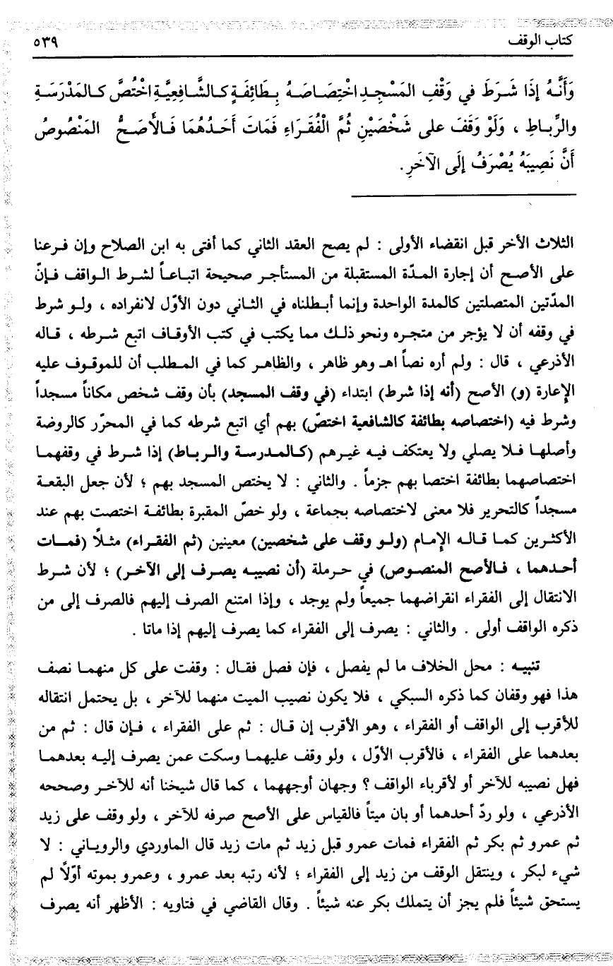 تَنْبِيهٌ مَحَلُّ الْخِلَافِ مَا لَمْ يَفْصِلْ، فَإِنْ فَصَلَ فَقَالَ: وَقَفْت عَلَى كُلٍّ مِنْهُمَا نِصْفَ هَذَا فَهُوَ وَقْفَانِ كَمَا ذَكَرَهُ السُّبْكِيُّ، فَلَا يَكُونُ نَصِيبُ الْمَيِّتِ مِنْهُمَا لِلْآخَرِ، بَلْ يَحْتَمِلُ انْتِقَالُهُ لِلْأَقْرَبِ إلَى الْوَاقِفِ أَوْ الْفُقَرَاءِ، وَهُوَ الْأَقْرَبُ إنْ قَالَ: ثُمَّ عَلَى الْفُقَرَاءِ، فَإِنْ قَالَ: ثُمَّ مِنْ بَعْدِهِمَا عَلَى الْفُقَرَاءِ، فَالْأَقْرَبُ الْأَوَّلُ، وَلَوْ وَقَفَ عَلَيْهِمَا وَسَكَتَ عَمَّنْ يُصْرَفُ إلَيْهِ بَعْدَهُمَا فَهَلْ نَصِيبُهُ لِلْآخَرِ أَوْ لِأَقْرِبَاءِ الْوَاقِفِ؟ وَجْهَانِ أَوْجَهُهُمَا، كَمَا قَالَ شَيْخُنَا أَنَّهُ لِلْآخَرِ وَصَحَّحَهُ الْأَذْرَعِيُّ، وَلَوْ رَدَّ أَحَدُهُمَا أَوْ بَانَ مَيِّتًا فَالْقِيَاسُ عَلَى الْأَصَحِّ صَرْفُهُ لِلْآخَرِ، وَلَوْ وَقَفَ عَلَى زَيْدٍ ثُمَّ عَمْرٍو ثُمَّ بَكْرٍ ثُمَّ الْفُقَرَاءِ فَمَاتَ عَمْرٌو قَبْلَ زَيْدٍ ثُمَّ مَاتَ زَيْدٌ قَالَ الْمَاوَرْدِيُّ وَالرُّويَانِيُّ: لَا شَيْءَ لِبَكْرٍ، وَيَنْتَقِلُ الْوَقْفُ مِنْ زَيْدٍ إلَى الْفُقَرَاءِ؛ لِأَنَّهُ رَتَّبَهُ بَعْدَ عَمْرٍو، وَعَمْرٌو بِمَوْتِهِ أَوَّلًا لَمْ يَسْتَحِقَّ شَيْئًا فَلَمْ يَجُزْ أَنْ يَتَمَلَّكَ بَكْرٌ عَنْهُ شَيْئًا. وَقَالَ الْقَاضِي فِي فَتَاوِيهِ: الْأَظْهَرُ أَنَّهُ يُصْرَفُ