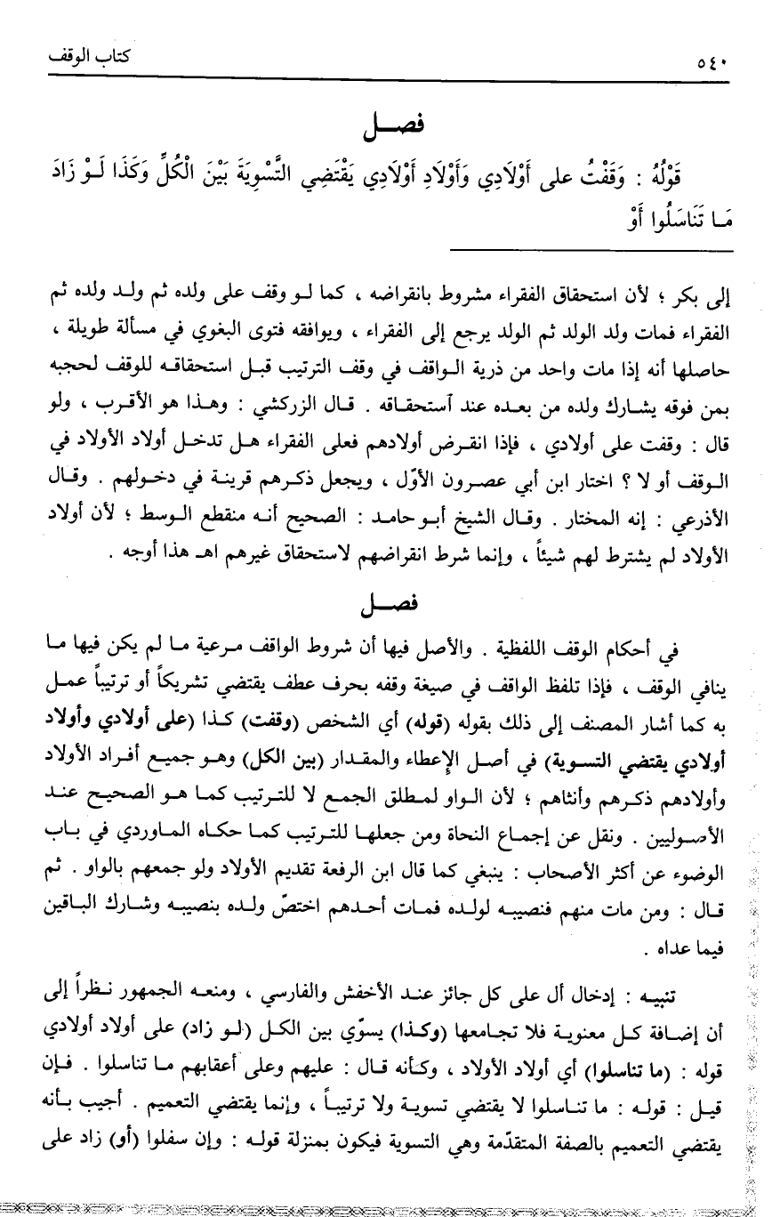 ِ. وَالْأَصْلُ فِيهَا أَنَّ شُرُوطَ الْوَاقِفِ مَرْعِيَّةٌ مَا لَمْ يَكُنْ فِيهَا مَا يُنَافِي الْوَقْفَ، فَإِذَا تَلَفَّظَ الْوَاقِفُ فِي صِيغَةِ وَقْفِهِ بِحَرْفِ عَطْفٍ يَقْتَضِي تَشْرِيكًا أَوْ تَرْتِيبًا عُمِلَ بِهِ كَمَا أَشَارَ الْمُصَنِّفُ إلَى ذَلِكَ بِقَوْلِهِ. (قَوْلُهُ) أَيْ الشَّخْصُ (وَقَفْت) كَذَا (عَلَى أَوْلَادِي وَأَوْلَادِ أَوْلَادِي يَقْتَضِي التَّسْوِيَةَ) فِي أَصْلِ الْإِعْطَاءِ وَالْمِقْدَارِ (بَيْنَ الْكُلِّ) وَهُوَ جَمِيعُ أَفْرَادِ الْأَوْلَادِ وَأَوْلَادُهُمْ ذَكَرُهُمْ وَأُنْثَاهُمْ؛ لِأَنَّ الْوَاوَ لِمُطْلَقِ الْجَمْعِ لَا لِلتَّرْتِيبِ كَمَا هُوَ الصَّحِيحُ عِنْدَ الْأُصُولِيِّينَ. وَنُقِلَ عَنْ إجْمَاعِ النُّحَاةِ وَمَنْ جَعَلَهَا لِلتَّرْتِيبِ كَمَا حَكَاهُ الْمَاوَرْدِيُّ فِي بَابِ الْوُضُوءِ عَنْ أَكْثَرِ الْأَصْحَابِ: يَنْبَغِي كَمَا قَالَ ابْنُ الرِّفْعَةِ تَقْدِيمُ الْأَوْلَادِ وَلَوْ جَمَعَهُمْ بِالْوَاوِ. ثُمَّ قَالَ: وَمَنْ مَاتَ مِنْهُمْ فَنَصِيبُهُ لِوَلَدِهِ فَمَاتَ أَحَدُهُمْ اُخْتُصَّ وَلَدُهُ بِنَصِيبِهِ وَشَارَكَ الْبَاقِينَ فِيمَا عَدَاهُ.