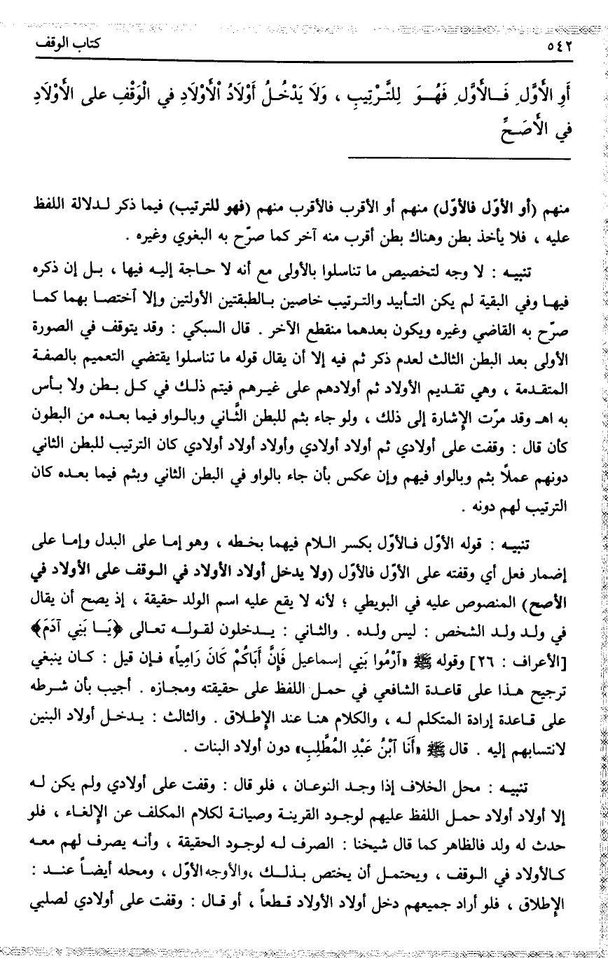 تَنْبِيهٌ: لَا وَجْهَ لِتَخْصِيصِ مَا تَنَاسَلُوا بِالْأُولَى مَعَ أَنَّهُ لَا حَاجَةَ إلَيْهِ فِيهَا، بَلْ إنْ ذَكَرَهُ فِيهَا وَفِي الْبَقِيَّةِ لَمْ يَكُنْ التَّأْبِيدُ وَالتَّرْتِيبُ خَاصَّيْنِ بِالطَّبَقَتَيْنِ الْأُولَتَيْنِ وَإِلَّا اُخْتُصَّا بِهِمَا كَمَا صَرَّحَ بِهِ الْقَاضِي وَغَيْرُهُ وَيَكُونُ بَعْدَهُمَا مُنْقَطِعُ الْآخِرِ. قَالَ السُّبْكِيُّ: وَقَدْ يَتَوَقَّفُ فِي الصُّورَةِ الْأُولَى بَعْدَ الْبَطْنِ الثَّالِثِ لِعَدَمِ ذِكْرِ ثُمَّ فِيهِ إلَّا أَنْ يُقَالَ قَوْلُهُ مَا تَنَاسَلُوا يَقْتَضِي التَّعْمِيمَ بِالصِّفَةِ الْمُتَقَدِّمَةِ، وَهِيَ تَقْدِيمُ الْأَوْلَادِ ثُمَّ أَوْلَادِهِمْ عَلَى غَيْرِهِمْ فَيَتِمُّ ذَلِكَ: فِي كُلِّ بَطْنٍ وَلَا بَأْسَ بِهِ اهـ.