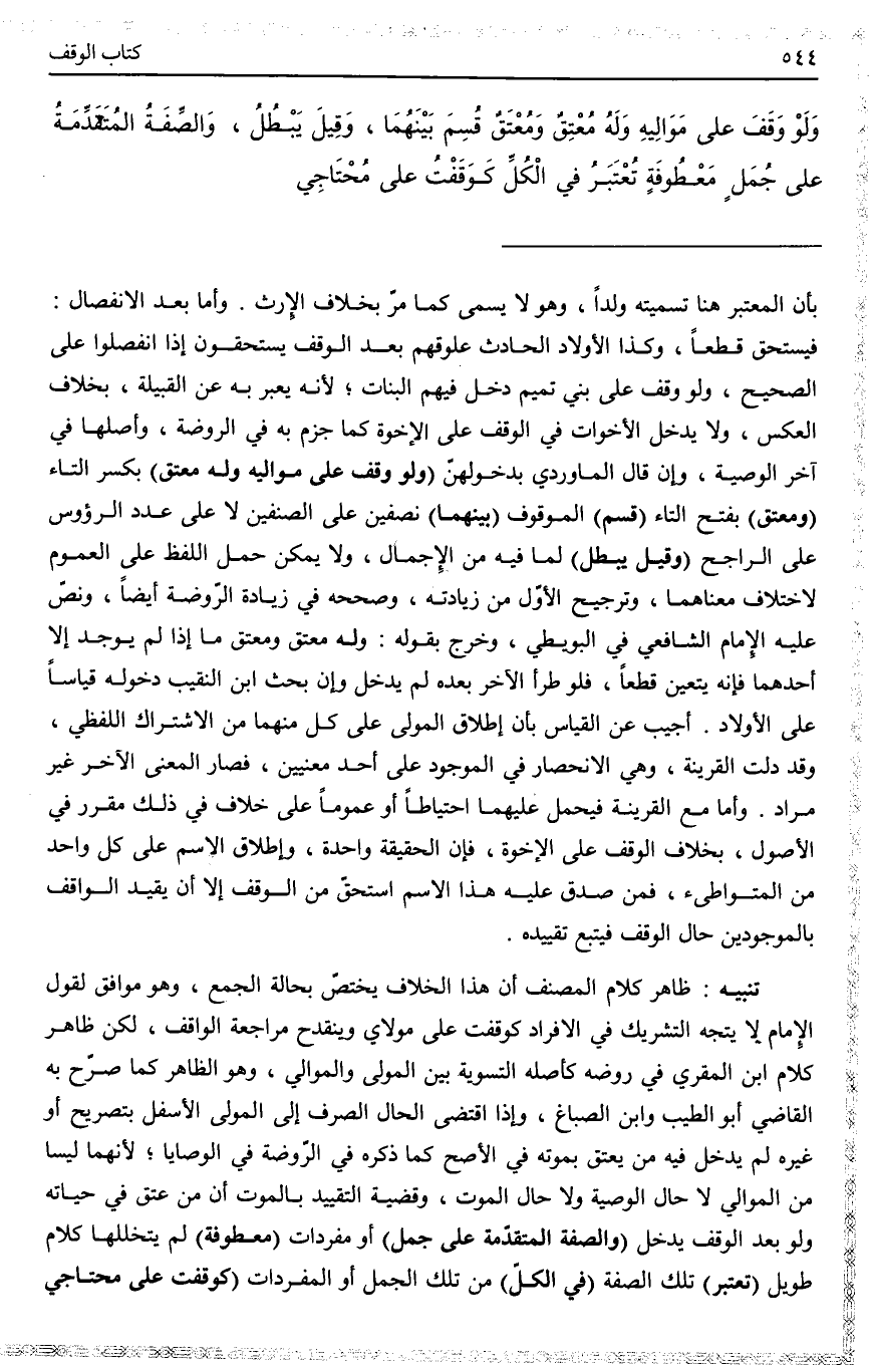 تَنْبِيهٌ ظَاهِرُ كَلَامِ الْمُصَنِّفِ أَنَّ هَذَا الْخِلَافَ يَخْتَصُّ بِحَالَةِ الْجَمْعِ، وَهُوَ مُوَافِقٌ لِقَوْلِ الْإِمَامِ لَا يَتَّجِهُ التَّشْرِيكُ فِي الْأَفْرَادِ كَوَقَفْت عَلَى مَوْلَايَ وَيَنْقَدِحُ مُرَاجَعَةُ الْوَاقِفِ، لَكِنَّ ظَاهِرَ كَلَامِ ابْنِ الْمُقْرِي فِي رَوْضِهِ كَأَصْلِهِ التَّسْوِيَةُ بَيْنَ الْمَوْلَى وَالْمَوَالِي، وَهُوَ الظَّاهِرُ كَمَا صَرَّحَ بِهِ الْقَاضِي أَبُو الطَّيِّبِ وَابْنُ الصَّبَّاغِ، وَإِذَا اقْتَضَى الْحَالُ الصَّرْفَ إلَى الْمَوْلَى الْأَسْفَلِ بِتَصْرِيحٍ أَوْ غَيْرِهِ لَمْ يَدْخُلْ فِيهِ مَنْ يَعْتِقُ بِمَوْتِهِ فِي الْأَصَحِّ كَمَا ذَكَرَهُ فِي الرَّوْضَةِ فِي الْوَصَايَا؛ لِأَنَّهُمَا لَيْسَا مِنْ الْمَوَالِي لَا حَالَ الْوَصِيَّةِ وَلَا حَالَ الْمَوْتِ، وَقَضِيَّةُ التَّقْيِيدِ بِالْمَوْتِ أَنَّ مَنْ عَتَقَ فِي حَيَاتِهِ وَلَوْ بَعْدَ الْوَقْفِ يَدْخُلُ (وَالصِّفَةُ الْمُتَقَدِّمَةُ عَلَى جُمَلٍ) أَوْ مُفْرَدَاتٍ (مَعْطُوفَةٍ) لَمْ يَتَخَلَّلْهَا كَلَامٌ طَوِيلٌ (تُعْتَبَرُ) تِلْكَ الصِّفَةُ (فِي الْكُلِّ) مِنْ تِلْكَ الْجُمَلِ أَوْ الْمُفْرَدَاتِ (كَوَقَفْت عَلَى مُحْتَاجِي
