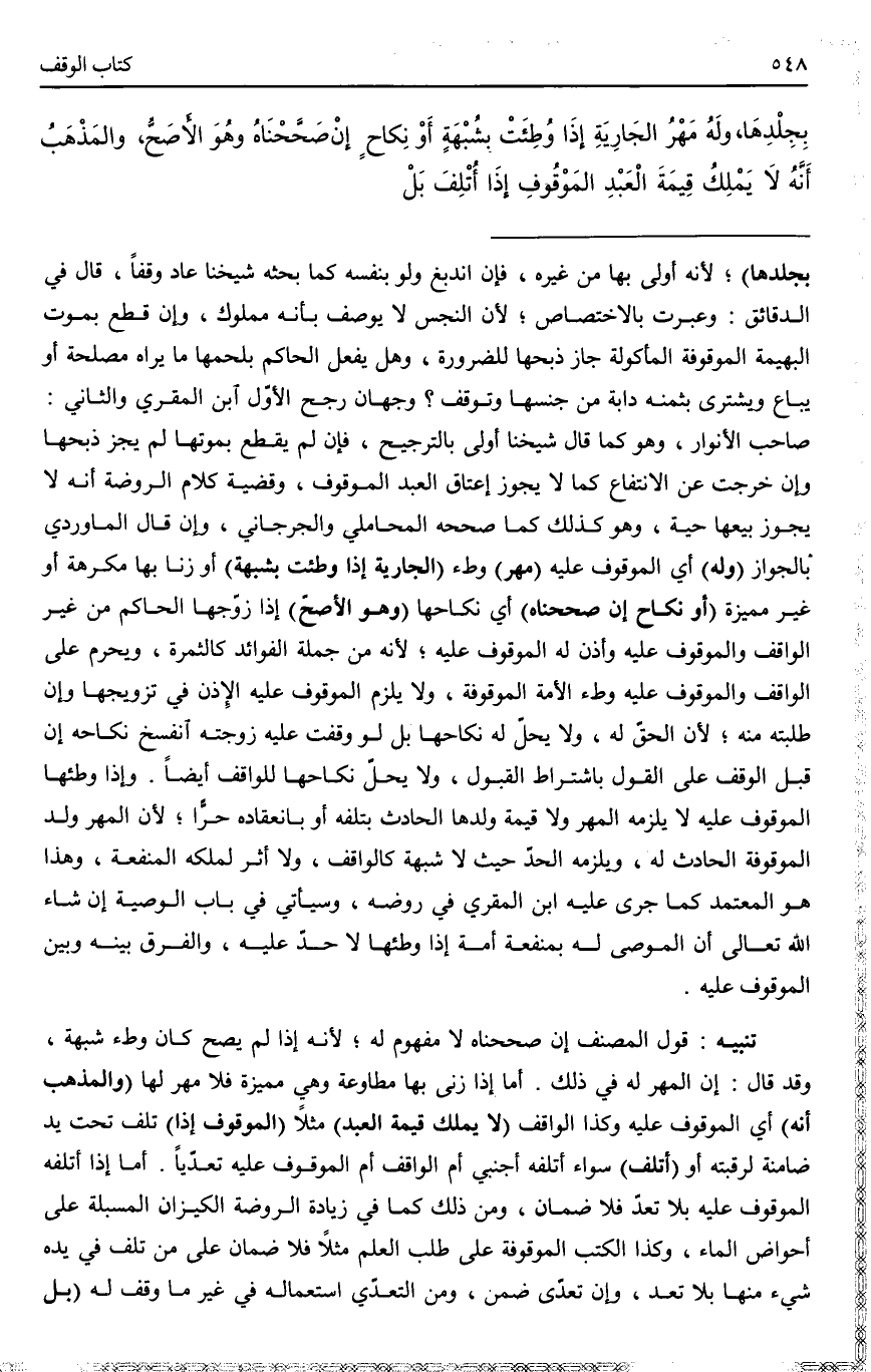 (وَلَهُ) أَيْ الْمَوْقُوفِ عَلَيْهِ (مَهْرُ) وَطْءِ (الْجَارِيَةِ إذَا وُطِئَتْ بِشُبْهَةٍ) أَوْ زَنَى بِهَا مُكْرَهَةً أَوْ غَيْرَ مُمَيِّزَةٍ (أَوْ نِكَاحٍ إنْ صَحَّحْنَاهُ) أَيْ نِكَاحَهَا (وَهُوَ الْأَصَحُّ) إذَا زَوَّجَهَا الْحَاكِمُ مِنْ غَيْرِ الْوَاقِفِ وَالْمَوْقُوفِ عَلَيْهِ وَأَذِنَ لَهُ الْمَوْقُوفُ عَلَيْهِ؛ لِأَنَّهُ مِنْ جُمْلَةِ الْفَوَائِدِ كَالثَّمَرَةِ، وَيَحْرُمُ عَلَى الْوَاقِفِ وَالْمَوْقُوفِ عَلَيْهِ وَطْءُ الْأَمَةِ الْمَوْقُوفَةِ، وَلَا يَلْزَمُ الْمَوْقُوفَ عَلَيْهِ الْإِذْنُ فِي تَزْوِيجِهَا وَإِنْ طَلَبَتْهُ مِنْهُ؛ لِأَنَّ الْحَقَّ لَهُ، وَلَا يَحِلُّ لَهُ نِكَاحُهَا بَلْ لَوْ وُقِفَتْ عَلَيْهِ زَوْجَتُهُ انْفَسَخَ نِكَاحُهُ إنْ قَبِلَ الْوَقْفَ عَلَى الْقَوْلِ بِاشْتِرَاطِ الْقَبُولِ، وَلَا يَحِلُّ نِكَاحُهَا لِلْوَاقِفِ أَيْضًا. وَإِذَا وَطِئَهَا الْمَوْقُوفُ عَلَيْهِ لَا يَلْزَمُهُ الْمَهْرُ وَلَا قِيمَةُ وَلَدِهَا الْحَادِثِ بِتَلَفِهِ أَوْ بِانْعِقَادِهِ حُرًّا؛ لِأَنَّ الْمَهْرَ وَلَدُ الْمَوْقُوفَةِ الْحَادِثُ لَهُ، وَيَلْزَمُهُ الْحَدُّ حَيْثُ لَا شُبْهَةَ كَالْوَاقِفِ، وَلَا أَثَرَ لِمِلْكِهِ الْمَنْفَعَةَ، وَهَذَا هُوَ الْمُعْتَمَدُ كَمَا جَرَى عَلَيْهِ ابْنُ الْمُقْرِي فِي رَوْضِهِ، وَسَيَأْتِي فِي بَابِ الْوَصِيَّةِ إنْ شَاءَ اللَّهُ تَعَالَى أَنَّ الْمُوصَى لَهُ بِمَنْفَعَةِ أَمَةٍ إذَا وَطِئَهَا لَا حَدَّ عَلَيْهِ، وَالْفَرْقُ بَيْنَهُ وَبَيْنَ الْمَوْقُوفِ عَلَيْهِ.